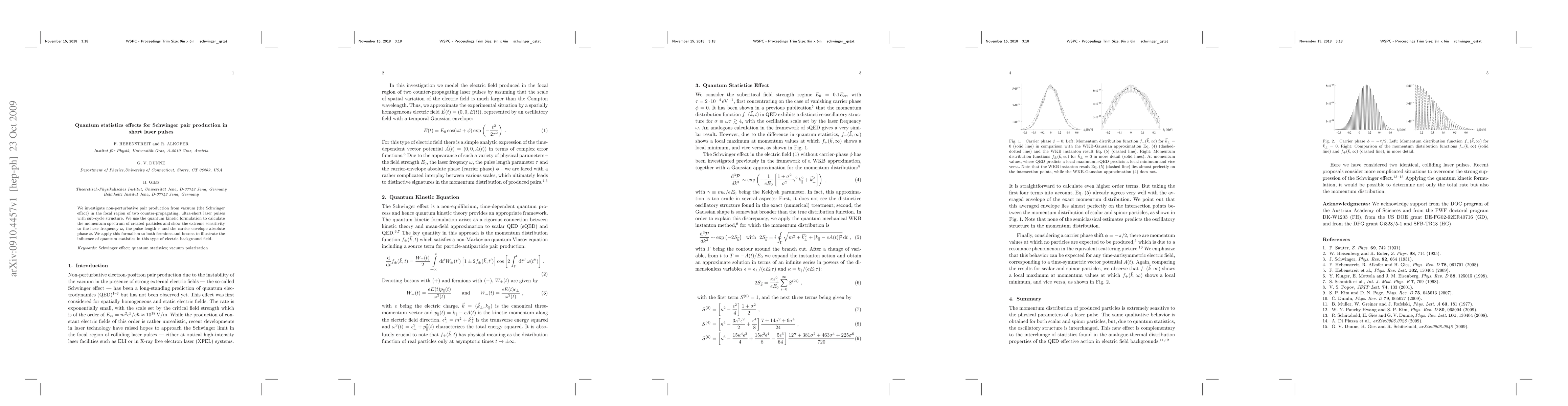 This study explores non-perturbative vacuum pair production (Schwinger effect) in the focal region of ultra-short, counter-propagating laser pulses, focusing on the quantum kinetic formulation to analyze particle momentum spectra. It highlights the significant impact of laser frequency, pulse length, and carrier-envelope phase, and examines the influence of quantum statistics on both fermions and bosons in such electric fields.