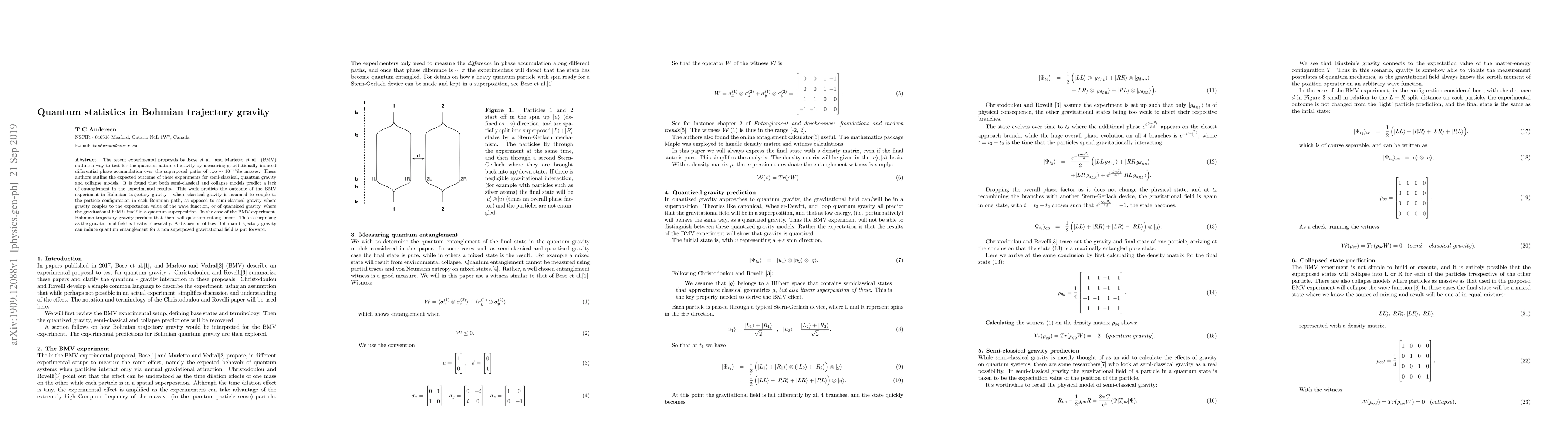 This paper examines quantum statistics in Bohmian trajectory gravity, predicting quantum entanglement in the BMV experiment despite treating gravity classically. This contrasts with semi-classical and collapse models that foresee no entanglement, highlighting the unique nature of Bohmian gravity.