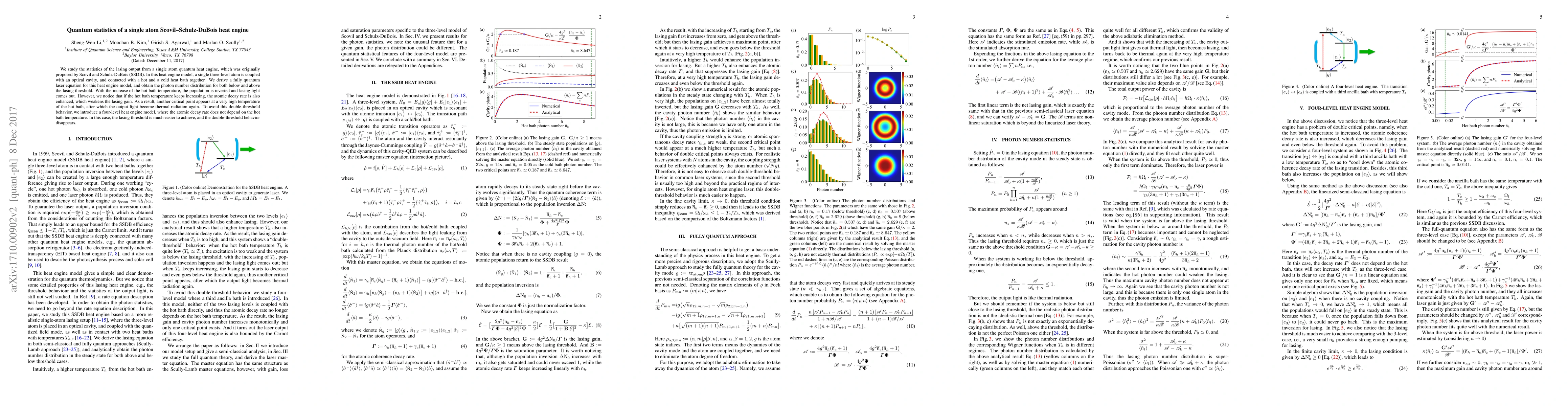 This paper investigates the quantum statistics of a single-atom Scovil-Schulz-DuBois heat engine, deriving a quantum laser equation and analyzing photon number distributions. It finds a double-threshold behavior due to temperature-dependent atomic decay rates, which is resolved by introducing a four-level heat engine model.