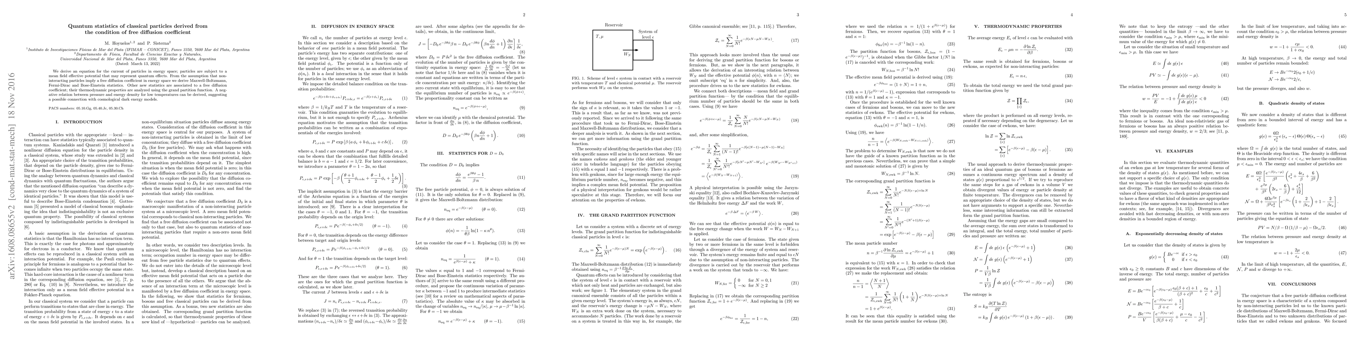 We derive an equation for the current of particles in energy space; particles are subject to a mean field effective potential that may represent quantum effects. From the assumption that non-interacting particles imply a free diffusion coefficient in energy space we derive Maxwell-Boltzmann, Fermi-Dirac and Bose-Einstein statistics. Other new statistics are associated to a free diffusion coefficient; their thermodynamic properties are analyzed using the grand partition function. A negative relation between pressure and energy density for low temperatures can be derived, suggesting a possible connection with cosmological dark energy models.