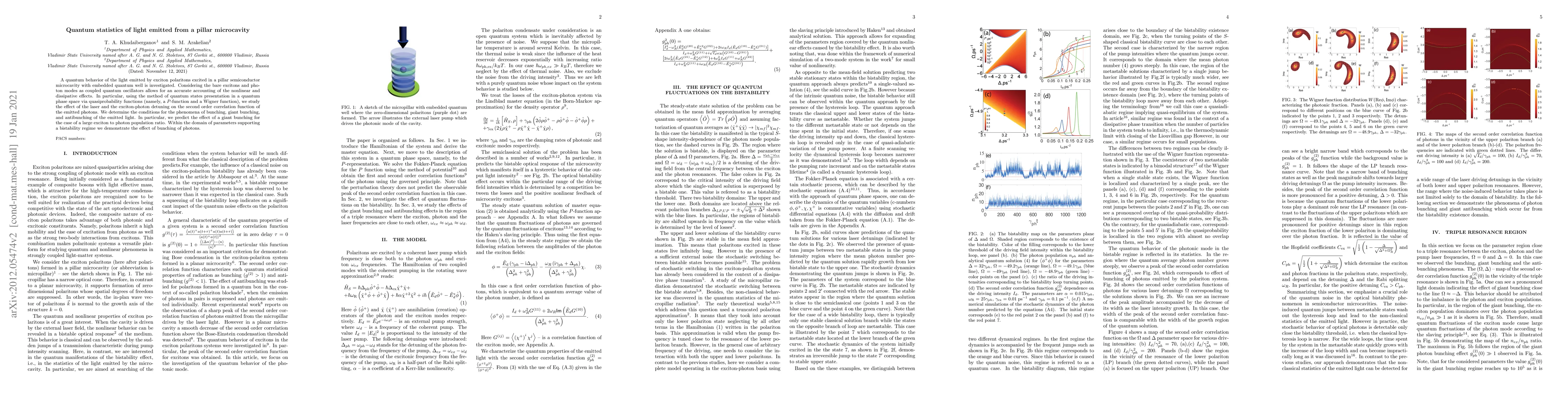 This paper investigates quantum statistics of light emitted from a pillar microcavity, focusing on exciton polaritons. It uses quantum phase space methods to analyze the second-order correlation function, predicting phenomena like giant bunching under high exciton-photon ratios and demonstrating photon bunching in a bistability regime.