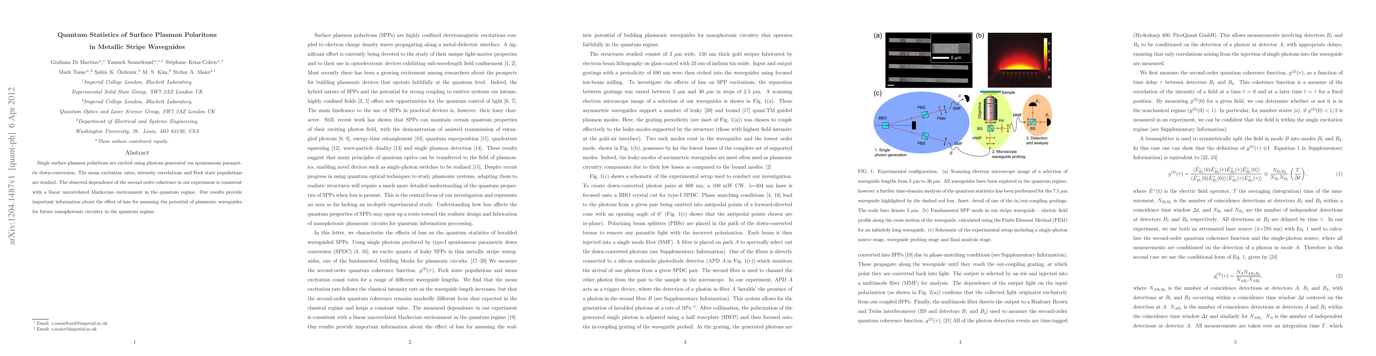 Single surface plasmon polaritons are excited using photons generated via spontaneous parametric down-conversion. The mean excitation rates, intensity correlations and Fock state populations are studied. The observed dependence of the second order coherence in our experiment is consistent with a linear uncorrelated Markovian environment in the quantum regime. Our results provide important information about the effect of loss for assessing the potential of plasmonic waveguides for future nanophotonic circuitry in the quantum regime.