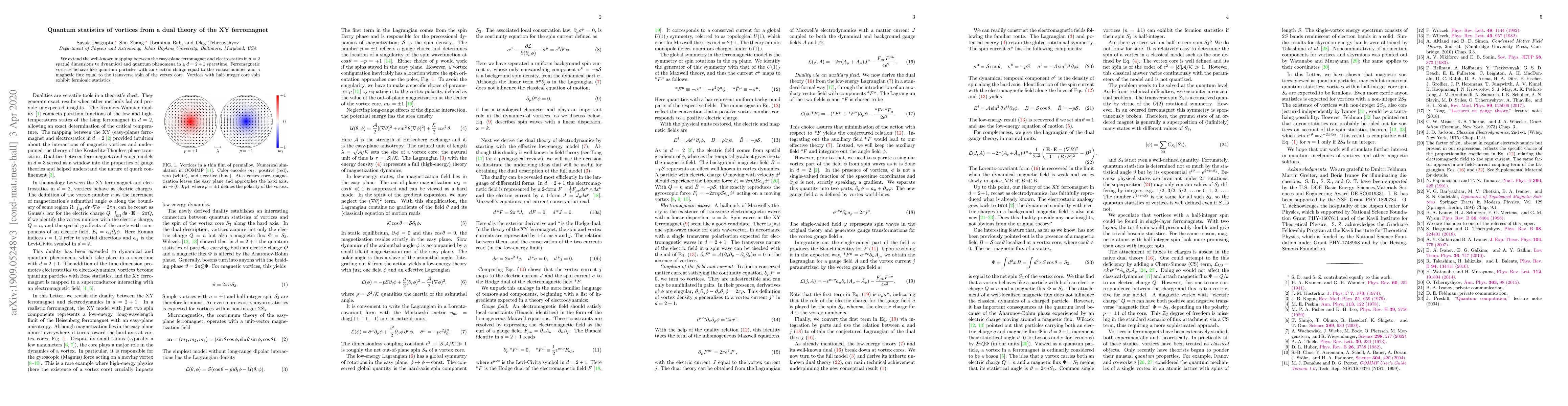 We extend the well-known mapping between the easy-plane ferromagnet and electrostatics in $d=2$ spatial dimensions to dynamical and quantum phenomena in a $d=2+1$ spacetime. Ferromagnetic vortices behave like quantum particles with an electric charge equal to the vortex number and a magnetic flux equal to the transverse spin of the vortex core. Vortices with half-integer core spin exhibit fermionic statistics.