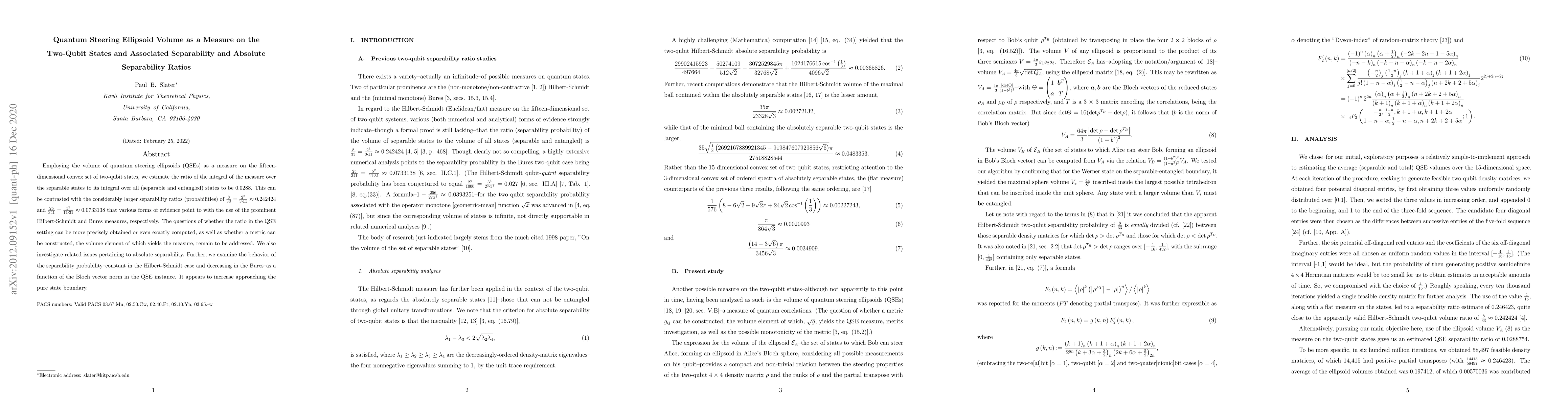 This paper uses the volume of quantum steering ellipsoids to measure two-qubit states, finding a separability ratio of 0.0288, contrasting with larger ratios from Hilbert-Schmidt and Bures measures. The study also explores the potential for a precise computation of this ratio and the construction of a metric for absolute separability.
