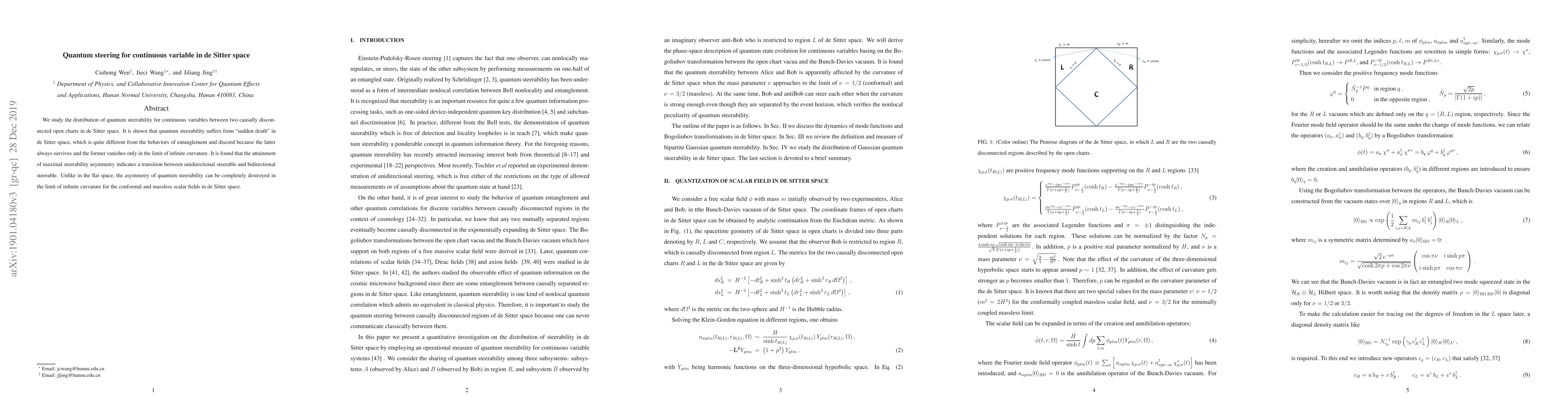 This paper investigates quantum steerability for continuous variables in de Sitter space, revealing that it experiences "sudden death" unlike entanglement and discord. It also highlights a transition between unidirectional and bidirectional steerability, noting that unlike flat space, the asymmetry of quantum steerability can be entirely lost in high curvature scenarios.