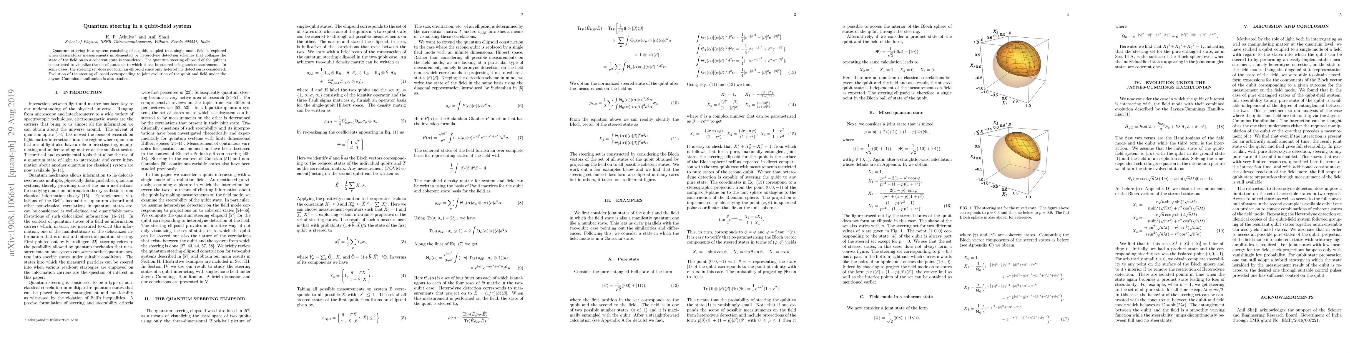 This paper investigates quantum steering in a qubit-field system where heterodyne detection collapses the field state into a coherent state. It constructs the quantum steering ellipsoid to visualize the qubit's steerable states, noting deviations from ellipsoidal shapes and studies the evolution under the Jaynes-Cummins Hamiltonian.