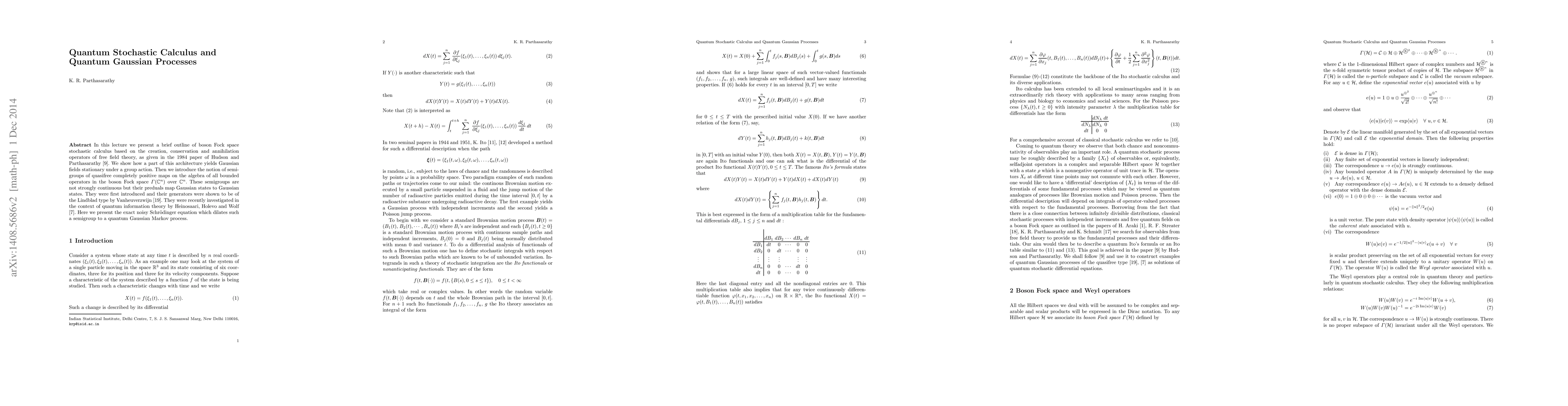 In this lecture we present a brief outline of boson Fock space stochastic calculus based on the creation, conservation and annihilation operators of free field theory, as given in the 1984 paper of Hudson and Parthasarathy. We show how a part of this architecture yields Gaussian fields stationary under a group action. Then we introduce the notion of semigroups of quasifree completely positive maps on the algebra of all bounded operators in the boson Fock space $\Gamma (\mathbb{C}^n)$ over $\mathbb{C}^n.$ These semigroups are not strongly continuous but their preduals map Gaussian states to Gaussian states. They were first introduced and their generators were shown to be of the Lindblad type by Vanheuverzwijn. They were recently investigated in the context of quantum information theory by Heinosaari, Holevo and Wolf. Here we present the exact noisy Schr\"odinger equation which dilates such a semigroup to a quantum Gaussian Markov process.