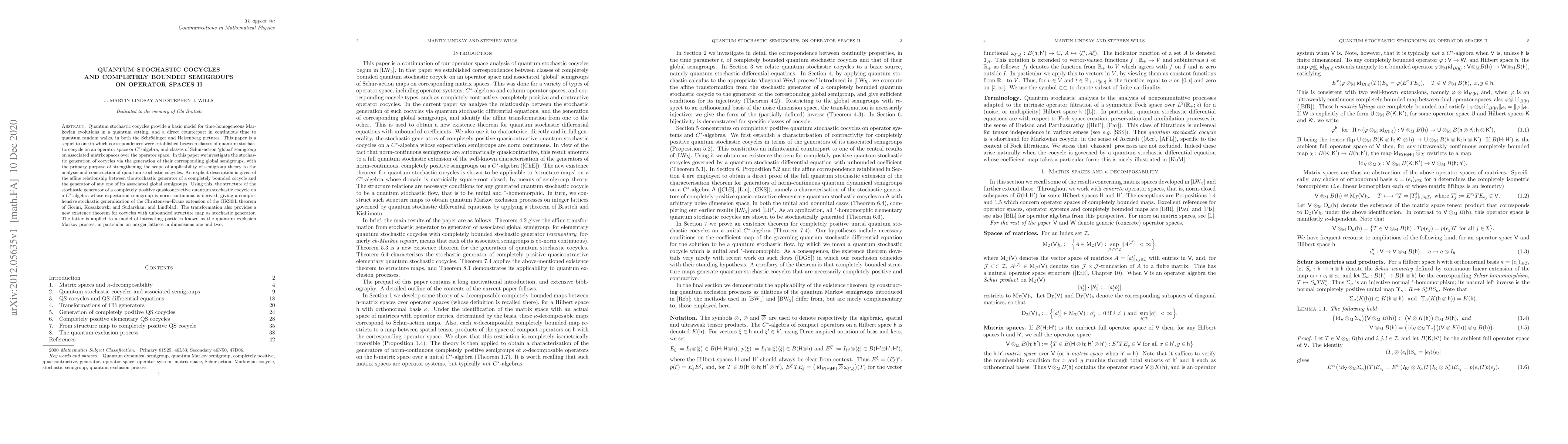 Quantum stochastic cocycles provide a basic model for time-homogeneous Markovian evolutions in a quantum setting, and a direct counterpart in continuous time to quantum random walks, in both the Schrodinger and Heisenberg pictures. This paper is a sequel to one in which correspondences were established between classes of quantum stochastic cocycle on an operator space or C*-algebra, and classes of Schur-action `global' semigroup on associated matrix spaces over the operator space. In this paper we investigate the stochastic generation of cocycles via the generation of their corresponding global semigroups, with the primary purpose of strengthening the scope of applicability of semigroup theory to the analysis and construction of quantum stochastic cocycles. An explicit description is given of the affine relationship between the stochastic generator of a completely bounded cocycle and the generator of any one of its associated global semigroups. Using this, the structure of the stochastic generator of a completely positive quasicontractive quantum stochastic cocycle on a C*-algebra whose expectation semigroup is norm continuous is derived, giving a comprehensive stochastic generalisation of the Christensen--Evans extension of the GKS&L theorem of Gorini, Kossakowski and Sudarshan, and Lindblad. The transformation also provides a new existence theorem for cocycles with unbounded structure map as stochastic generator. The latter is applied to a model of interacting particles known as the quantum exclusion Markov process, in particular on integer lattices in dimensions one and two.