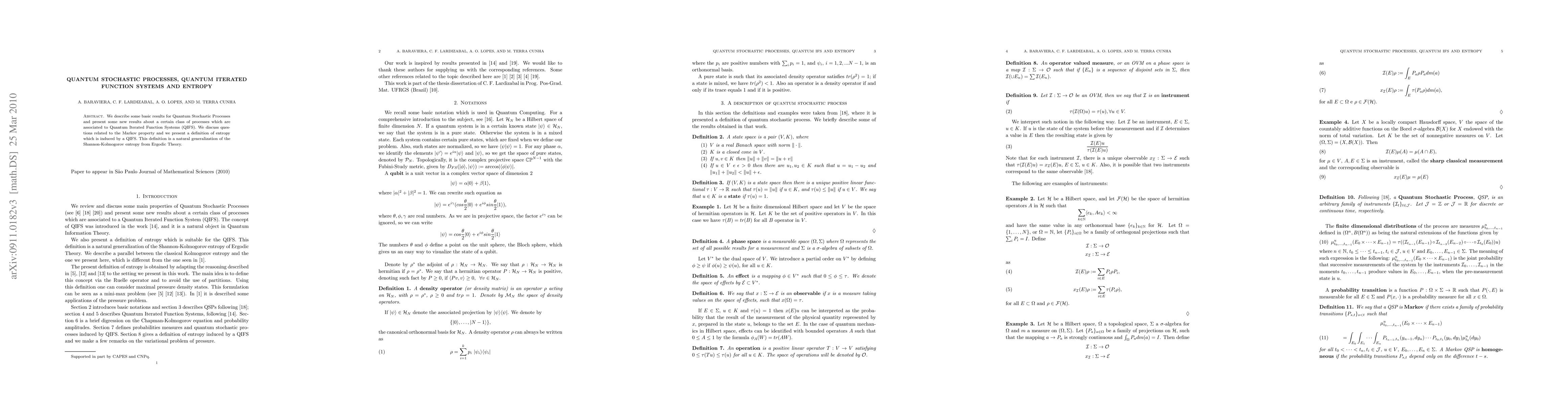 Summary: This paper explores Quantum Stochastic Processes and introduces a new class linked to Quantum Iterated Function Systems (QIFS), discussing the Markov property and presenting a novel entropy definition induced by QIFS, which generalizes Shannon-Kolmogorov entropy and differs from a prior definition by the same authors.