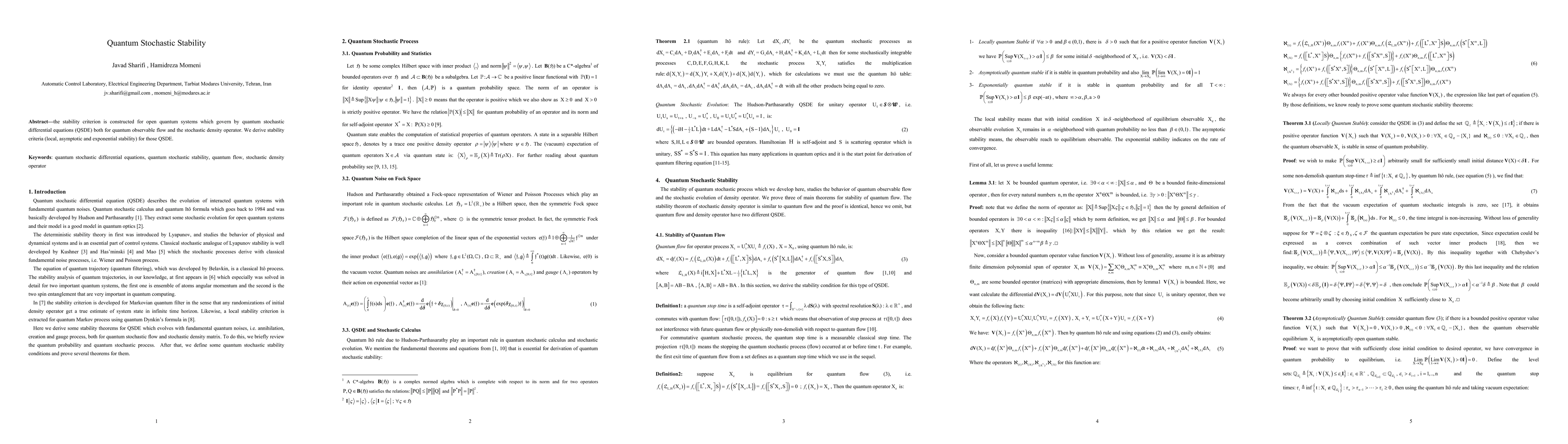 the stability criterion is constructed for open quantum systems which govern by quantum stochastic differential equations (QSDE) both for quantum observable flow and the stochastic density operator. We derive stability criteria (local, asymptotic and exponential stability) for those QSDE.