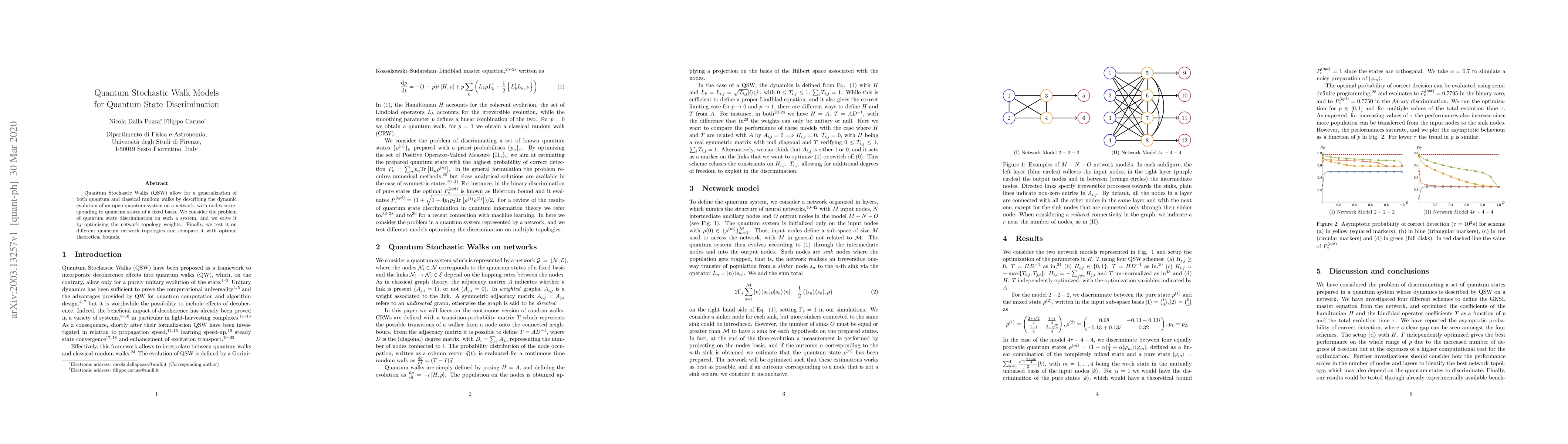 This paper proposes Quantum Stochastic Walk Models to generalize quantum and classical random walks for dynamic evolution in open quantum systems. The authors optimize network topology weights to solve quantum state discrimination and compare their results against theoretical bounds on various quantum network topologies.