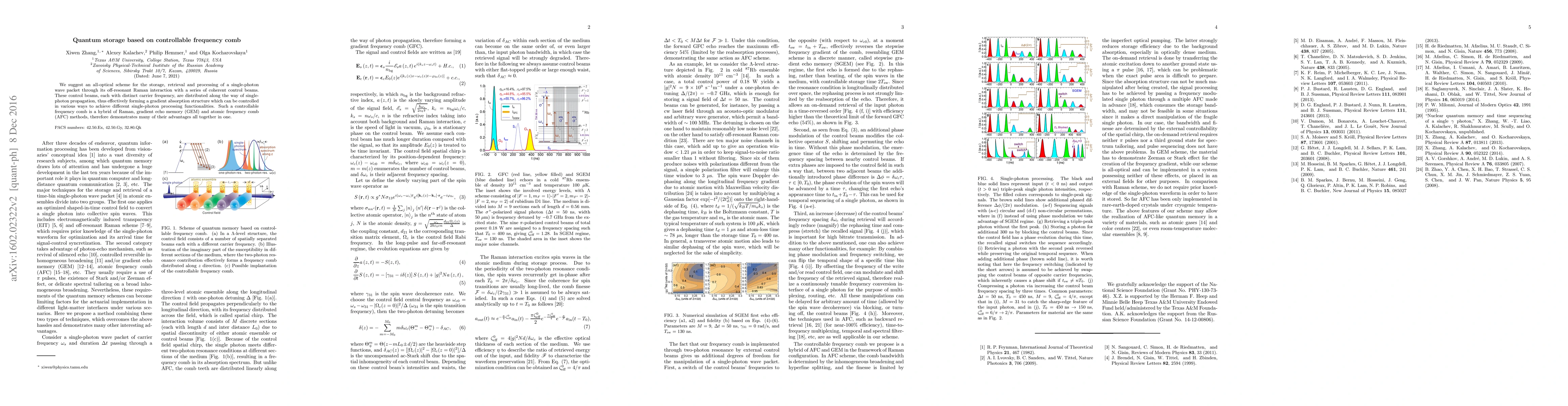 This paper proposes an all-optical quantum storage method using a controllable frequency comb to store, retrieve, and process single-photon wave packets via off-resonant Raman interaction with coherent control beams, combining the benefits of Raman, gradient echo memory, and atomic frequency comb techniques.
