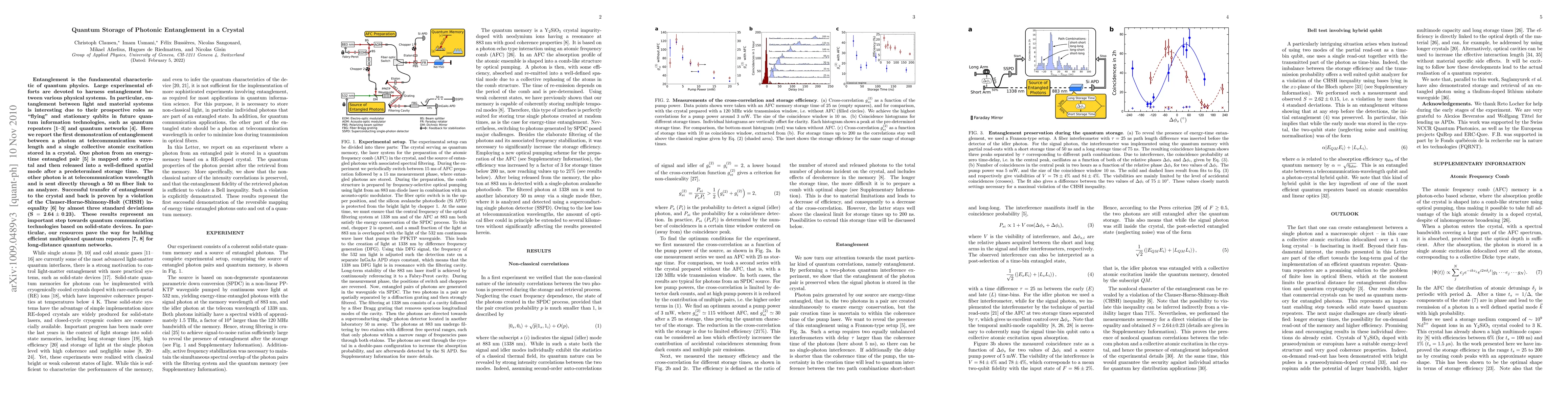 Entanglement is the fundamental characteristic of quantum physics. Large experimental efforts are devoted to harness entanglement between various physical systems. In particular, entanglement between light and material systems is interesting due to their prospective roles as "flying" and stationary qubits in future quantum information technologies, such as quantum repeaters and quantum networks. Here we report the first demonstration of entanglement between a photon at telecommunication wavelength and a single collective atomic excitation stored in a crystal. One photon from an energy-time entangled pair is mapped onto a crystal and then released into a well-defined spatial mode after a predetermined storage time. The other photon is at telecommunication wavelength and is sent directly through a 50 m fiber link to an analyzer. Successful transfer of entanglement to the crystal and back is proven by a violation of the Clauser-Horne-Shimony-Holt (CHSH) inequality by almost three standard deviations (S=2.64+/-0.23). These results represent an important step towards quantum communication technologies based on solid-state devices. In particular, our resources pave the way for building efficient multiplexed quantum repeaters for long-distance quantum networks.
