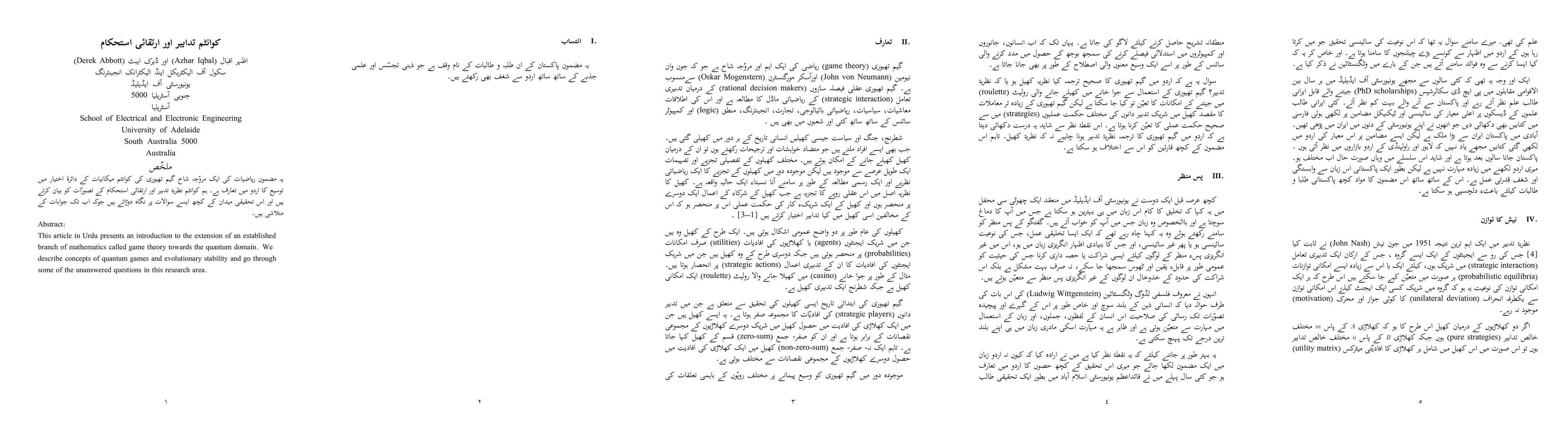 This article in Urdu presents an introduction to extension of an established branch of mathematics called game theory towards the quantum domain. We describe concepts of quantum games and evolutionary stability and go through some of the unanswered questions in this research area.