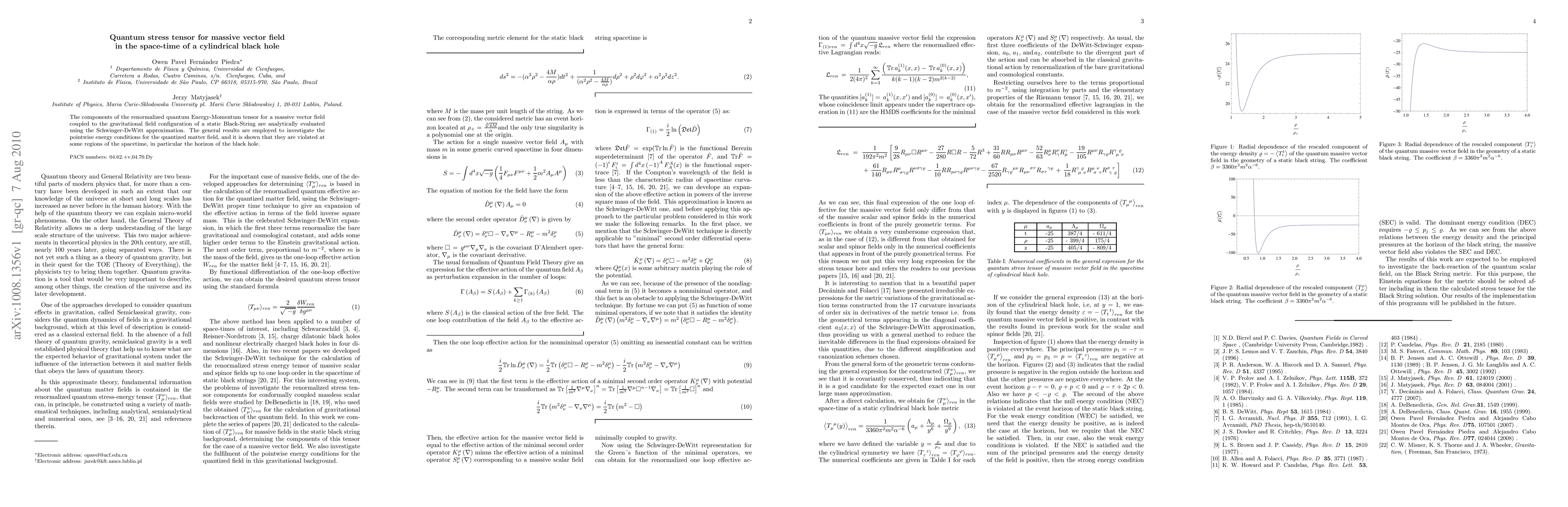 This paper evaluates the renormalized quantum Energy-Momentum tensor for a massive vector field in the gravitational field of a cylindrical black hole using the Schwinger-DeWitt approximation, revealing violations of pointwise energy conditions, particularly near the black hole horizon.
