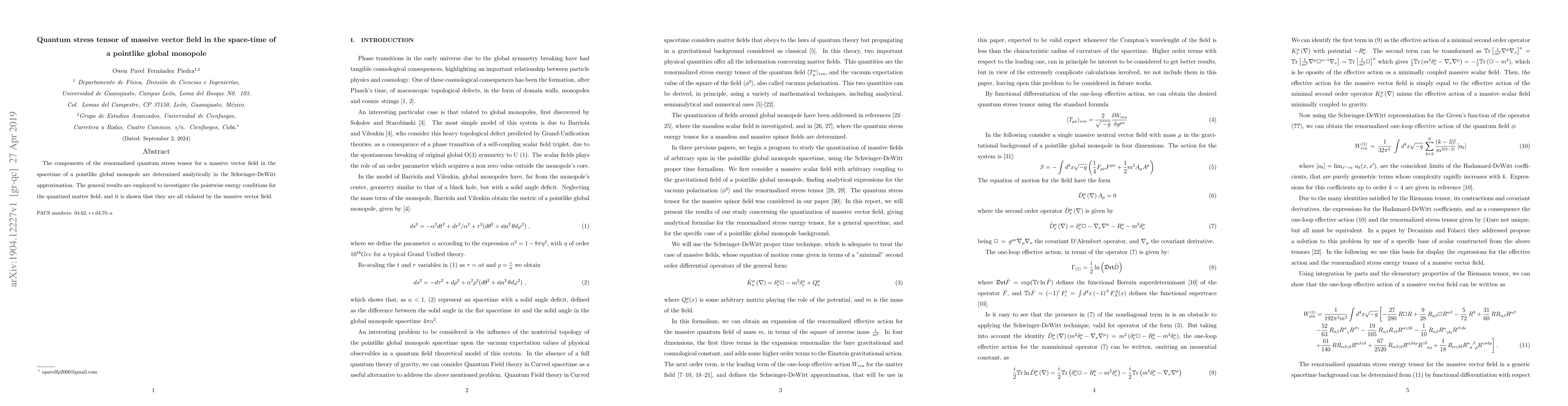 This paper analytically determines the renormalized quantum stress tensor for a massive vector field in the spacetime of a pointlike global monopole using the Schwinger-DeWitt approximation. It finds that the pointwise energy conditions for the quantized matter field are violated by this massive vector field.