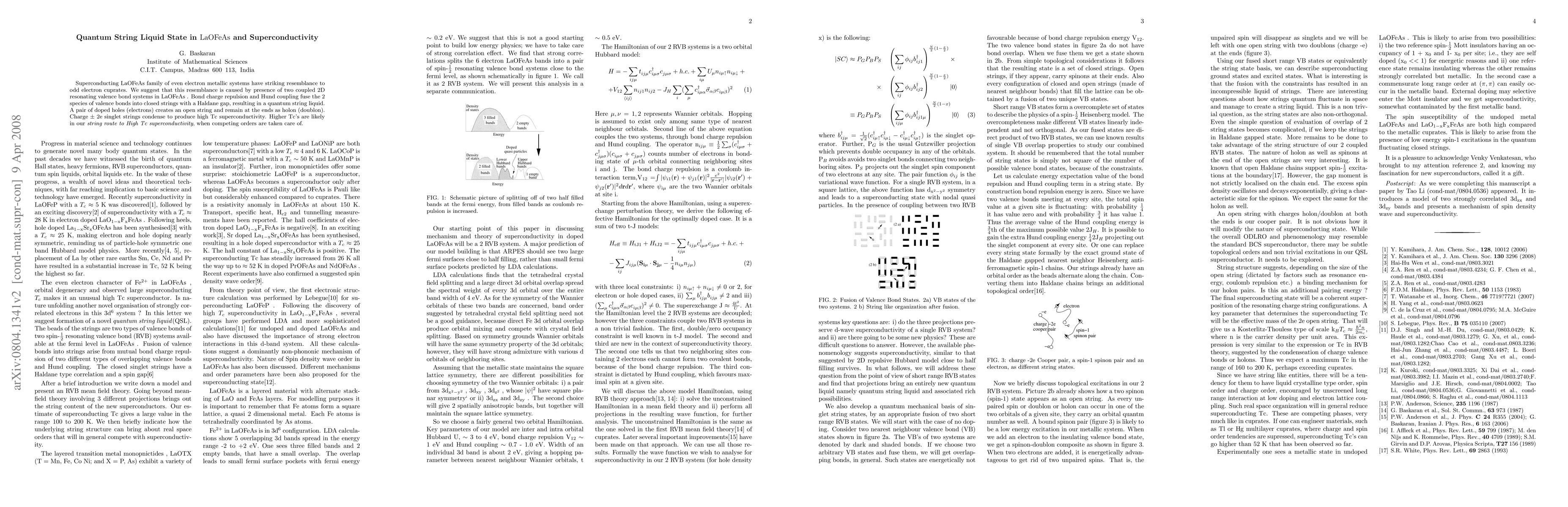 This paper proposes that the superconducting properties of LaOFeAs are due to a quantum string liquid state formed by coupled 2D resonating valence bond systems, leading to high-temperature superconductivity via charge-2e spin singlet strings. The presence of doped holes or electrons creates open strings that contribute to superconductivity.