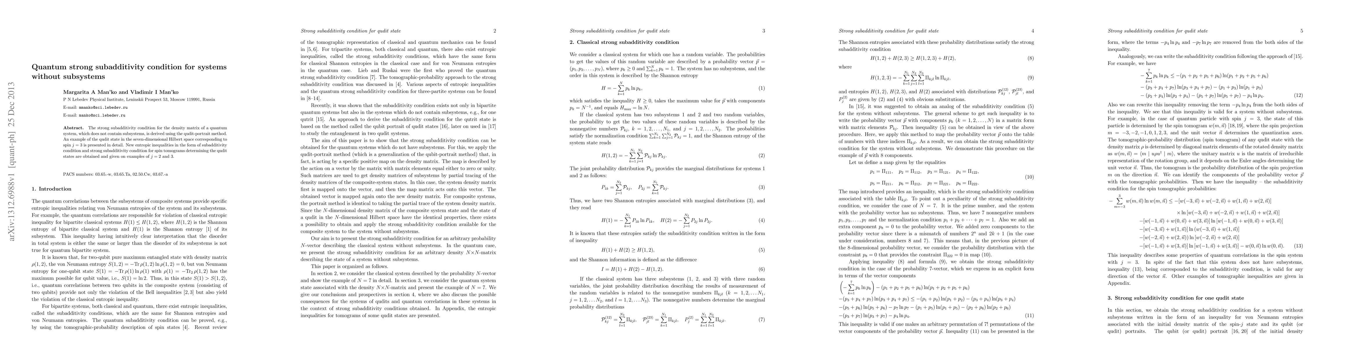The strong subadditivity condition for the density matrix of a quantum system, which does not contain subsystems, is derived using the qudit-portrait method. An example of the qudit state in the seven-dimensional Hilbert space corresponding to spin j = 3 is presented in detail. New entropic inequalities in the form of subadditivity condition and strong subadditivity condition for spin tomograms determining the qudit states are obtained and given on examples of j = 2 and 3.