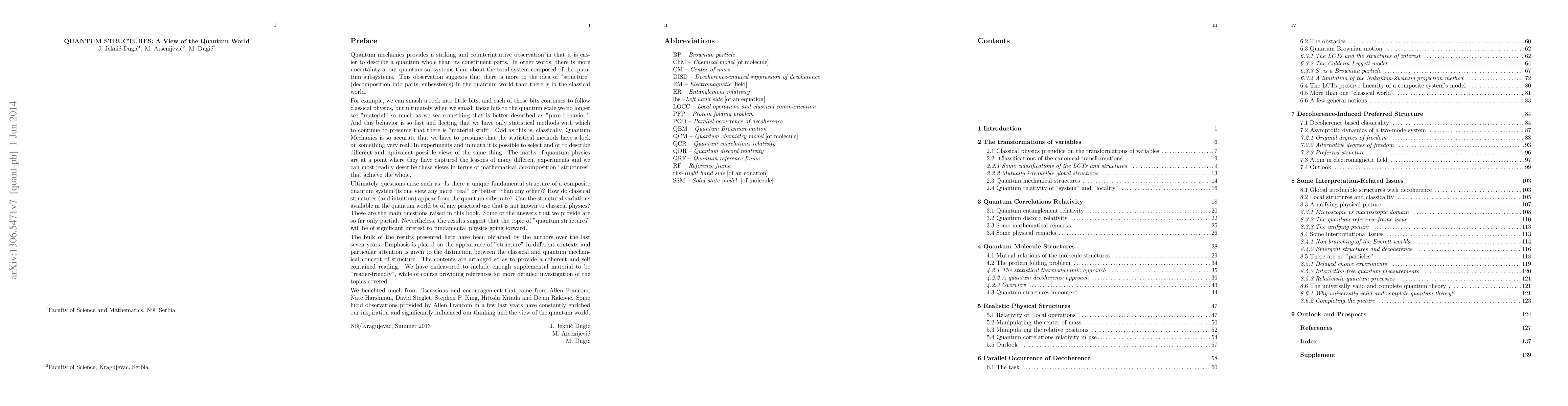 We offer a systematic account of decomposition of quantum systems into parts. Different decompositions (structures) are mutually linked via the proper linear canonical transformations. Different kinds of structures, as well as their relations, are considered. Emphasis is placed on mutually global and irreducible structures. Is there a privileged structure of the closed system? Is there a preferred (bipartite) structure of an open system? Are there any practical advantages of certain alternative structures of the system? Is there a simple dynamical relation for a pair of structures? The [necessarily partial] answers are rather intriguing. Relativity of quantum correlations (that include entanglement as well as the "one-way" and "two-way" discord) is carefully presented. Emphasis is placed on the "parallel occurrence of decoherence" in the quantum Brownian motion. The environment-selected preferred structure of an open composite system is presented for a pair of harmonic oscillators (or the field modes). A limitation of the Nakajima-Zwanzig projection method appears as a consequence of quantum correlations relativity. Hence, describing dynamics of an alternate open-system is a delicate task. Certain interpretational issues, which include "quantum reference frames" issue, are discussed. Some recent experiments are also discussed. To this end, the option that "there are no particles" on the most fundamental physical level naturally follows. Certain open questions and prospects for further research are highlighted.
