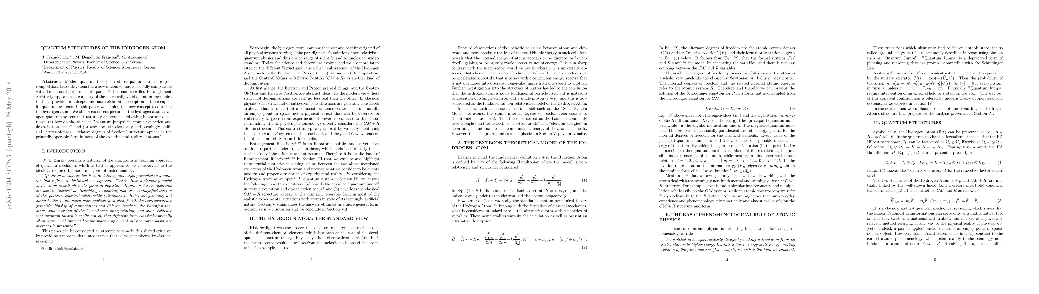 Modern quantum theory introduces quantum structures (decompositions into subsystems) as a new discourse that is not fully comparable with the classical-physics counterpart. To this end, so-called Entanglement Relativity appears as a corollary of the universally valid quantum mechanics that can provide for a deeper and more elaborate description of the composite quantum systems. In this paper we employ this new concept to describe the hydrogen atom. We offer a consistent picture of the hydrogen atom as an open quantum system that naturally answers the following important questions: (a) how do the so called "quantum jumps" in atomic excitation and de-excitation occur? and (b) why does the classically and seemingly artificial "center-of-mass + relative degrees of freedom" structure appear as the primarily operable form in most of the experimental reality of atoms?