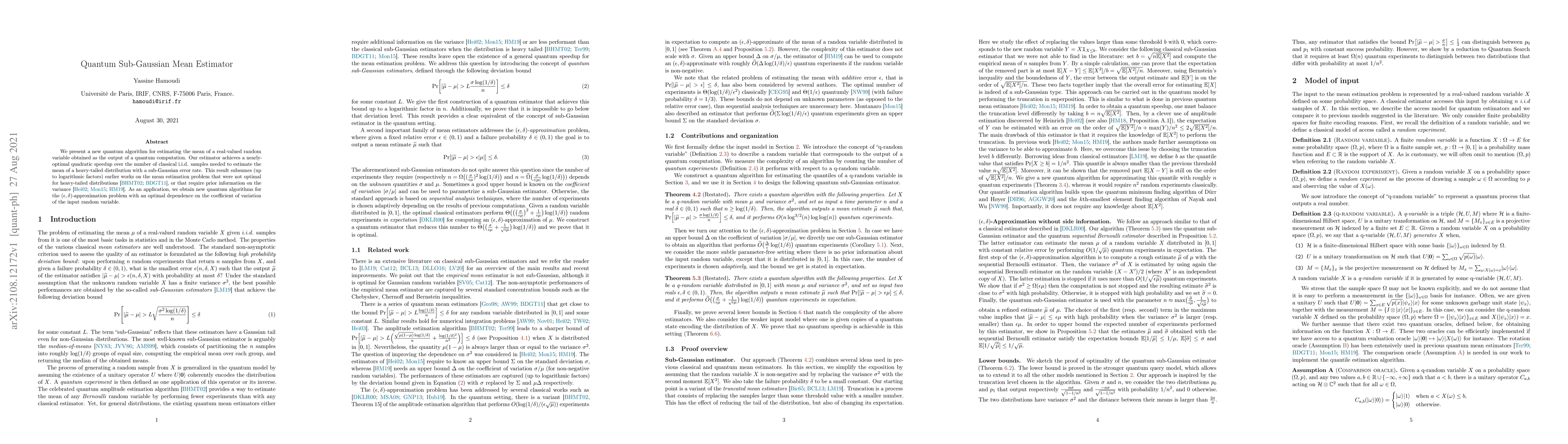We present a new quantum algorithm for estimating the mean of a real-valued random variable obtained as the output of a quantum computation. Our estimator achieves a nearly-optimal quadratic speedup over the number of classical i.i.d. samples needed to estimate the mean of a heavy-tailed distribution with a sub-Gaussian error rate. This result subsumes (up to logarithmic factors) earlier works on the mean estimation problem that were not optimal for heavy-tailed distributions [BHMT02,BDGT11], or that require prior information on the variance [Hein02,Mon15,HM19]. As an application, we obtain new quantum algorithms for the $(\epsilon,\delta)$-approximation problem with an optimal dependence on the coefficient of variation of the input random variable.