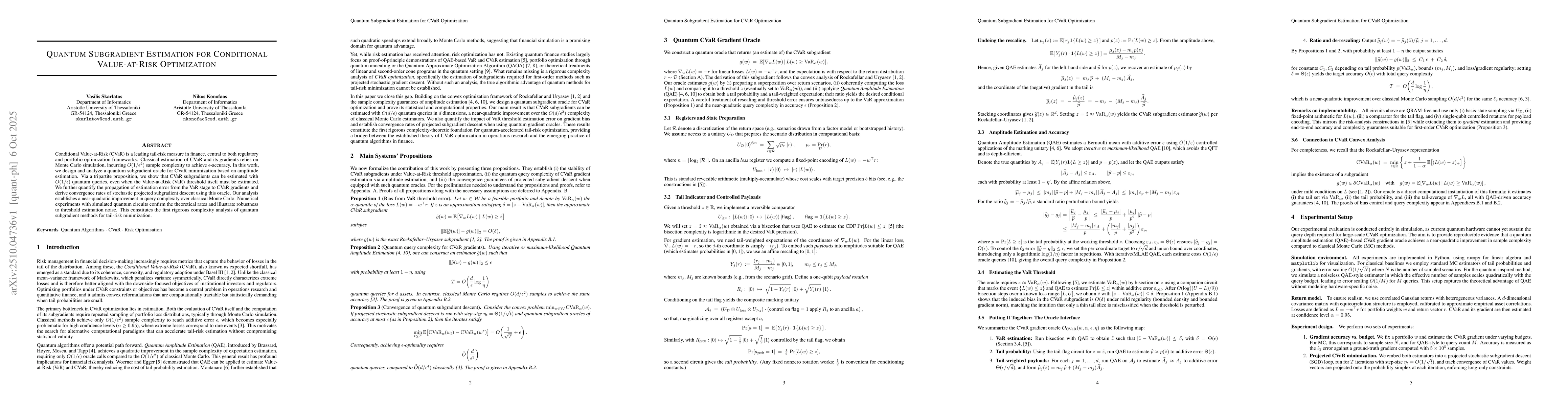 The paper proposes a quantum subgradient oracle for Conditional Value-at-Risk (CVaR) minimization using amplitude estimation. It combines quantum amplitude estimation (QAE) with classical statistical methods to estimate conditional expectations required for CVaR computation.