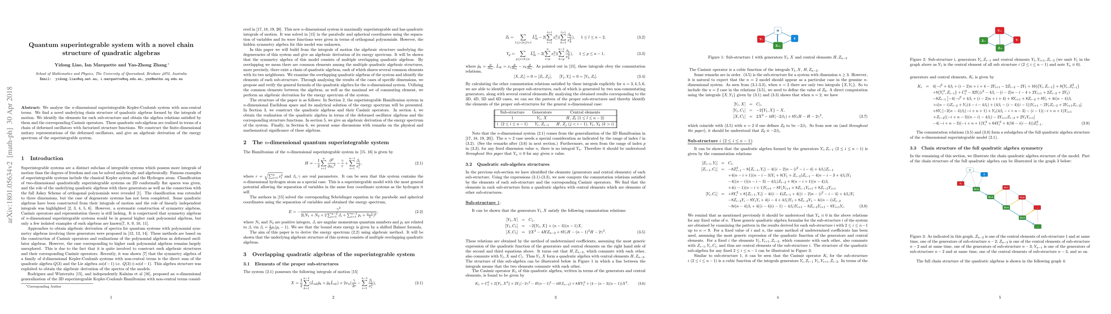 This paper explores the $n$-dimensional superintegrable Kepler-Coulomb system with non-central terms, revealing a novel chain structure of quadratic algebras formed by its integrals of motion. The study derives finite-dimensional unitary representations of deformed oscillators and provides an algebraic derivation for the system's energy spectrum.