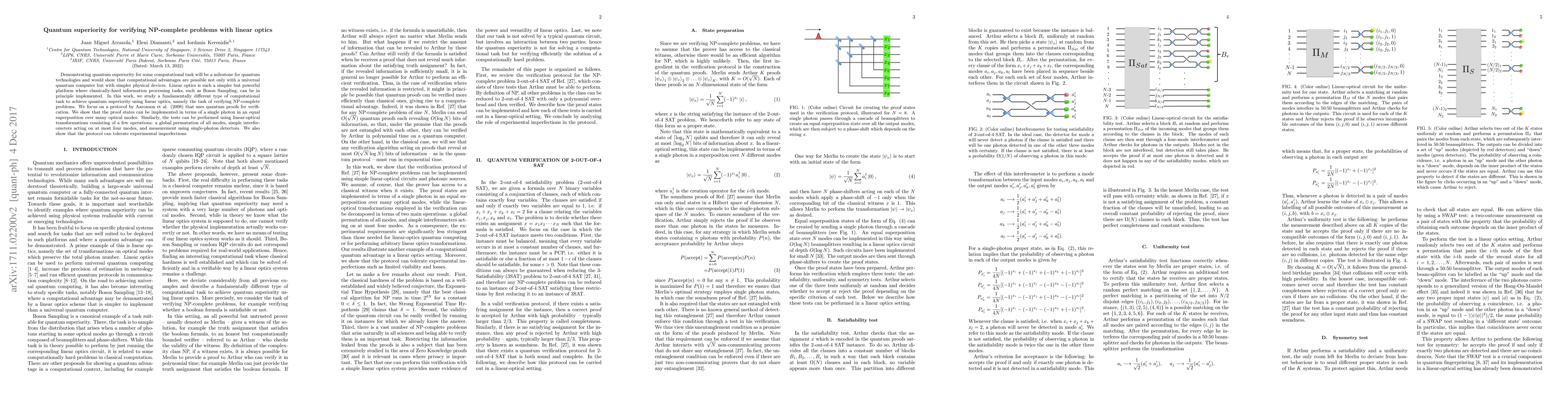 This paper demonstrates quantum superiority for verifying NP-complete problems using linear optics, showing that simpler quantum devices can outperform classical methods. The study implements quantum proofs and tests through basic linear-optical operations, proving the protocol's resilience to experimental imperfections.