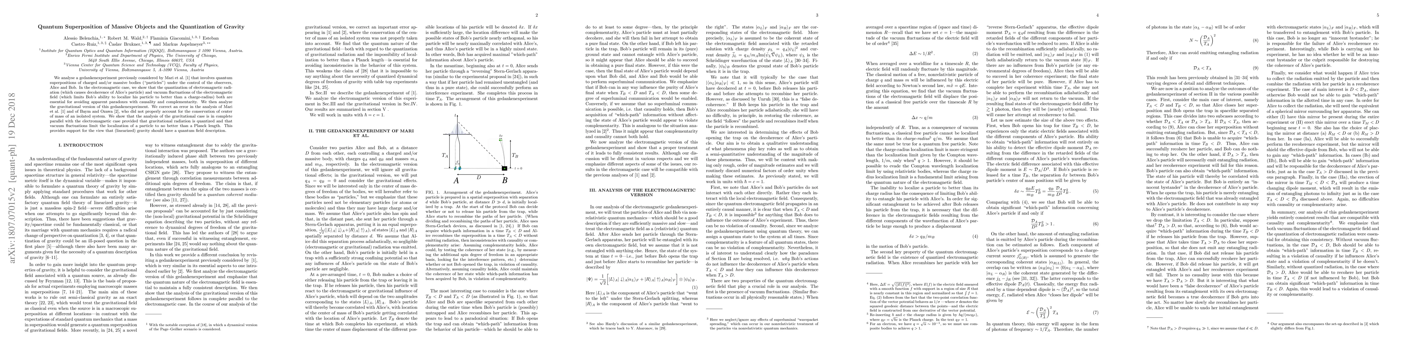 We analyse a gedankenexperiment previously considered by Mari et al. that involves quantum superpositions of charged and/or massive bodies ("particles") under the control of the observers, Alice and Bob. In the electromagnetic case, we show that the quantization of electromagnetic radiation (which causes decoherence of Alice's particle) and vacuum fluctuations of the electromagnetic field (which limits Bob's ability to localize his particle to better than a charge-radius) both are essential for avoiding apparent paradoxes with causality and complementarity. We then analyze the gravitational version of this gedankenexperiment. We correct an error in the analysis of Mari et al. and of Baym and Ozawa, who did not properly account for the conservation of center of mass of an isolated system. We show that the analysis of the gravitational case is in complete parallel with the electromagnetic case provided that gravitational radiation is quantized and that vacuum fluctuations limit the localization of a particle to no better than a Planck length. This provides support for the view that (linearized) gravity should have a quantum field description.