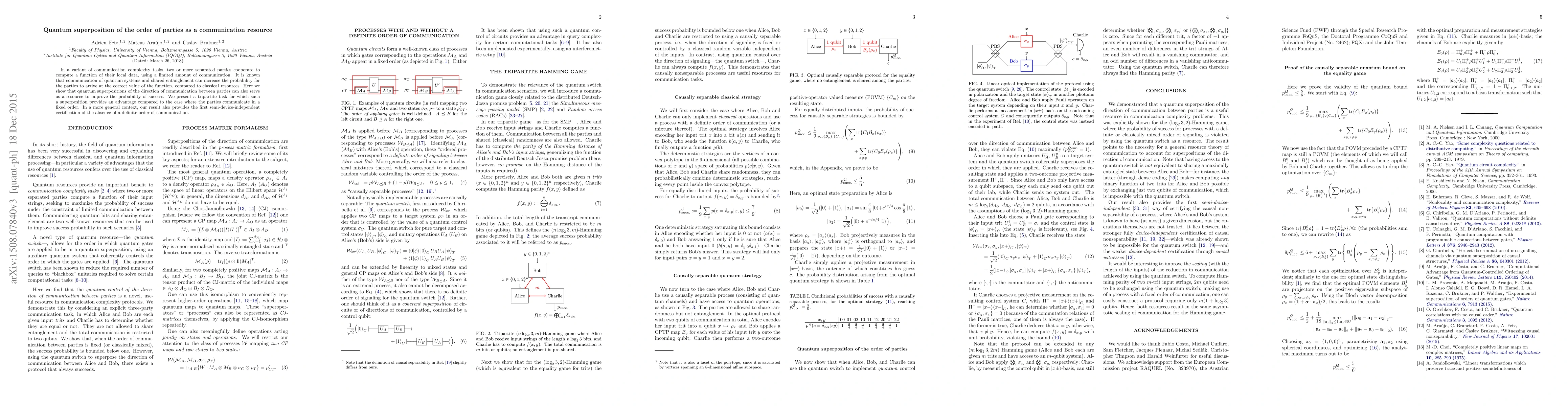 In a variant of communication complexity tasks, two or more separated parties cooperate to compute a function of their local data, using a limited amount of communication. It is known that communication of quantum systems and shared entanglement can increase the probability for the parties to arrive at the correct value of the function, compared to classical resources. Here we show that quantum superpositions of the direction of communication between parties can also serve as a resource to improve the probability of success. We present a tripartite task for which such a superposition provides an advantage compared to the case where the parties communicate in a fixed order. In a more general context, our result also provides the first semi-device-independent certification of the absence of a definite order of communication.