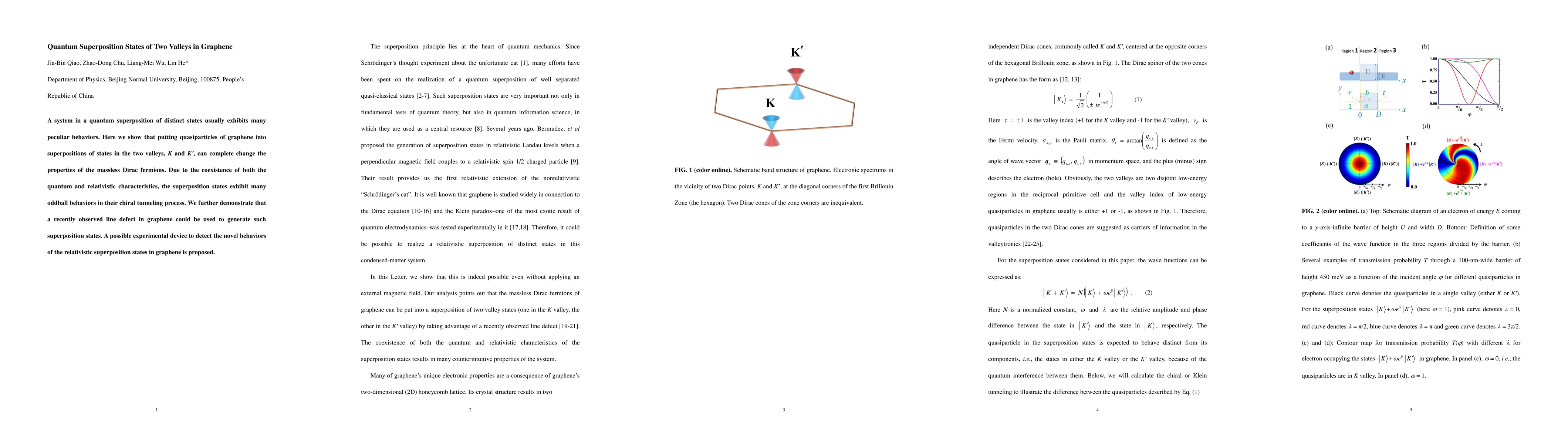 A system in a quantum superposition of distinct states usually exhibits many peculiar behaviors. Here we show that putting quasiparticles of graphene into superpositions of states in the two valleys can complete change the properties of the massless Dirac fermions. Due to the coexistence of both the quantum and relativistic characteristics, the superposition states exhibit many oddball behaviors in their chiral tunneling process. We further demonstrate that a recently observed line defect in graphene could be used to generate such superposition states. A possible experimental device to detect the novel behaviors of the relativistic superposition states in graphene is proposed.