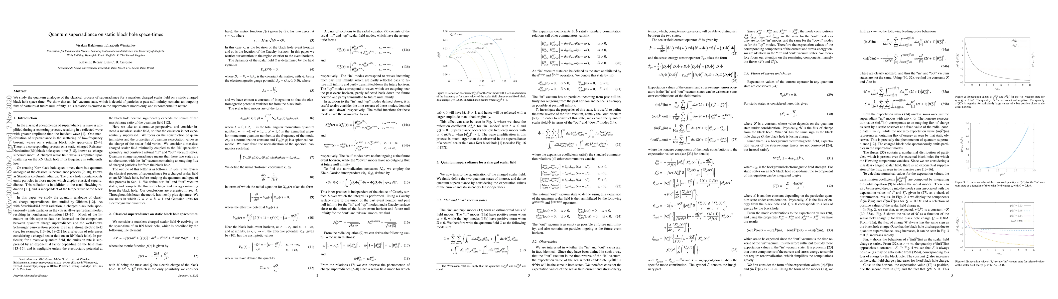This paper investigates quantum superradiance for a massless charged scalar field on static charged black hole space-times, demonstrating that an "in" vacuum state emits a nonthermal flux of particles in superradiant modes at future null infinity.
