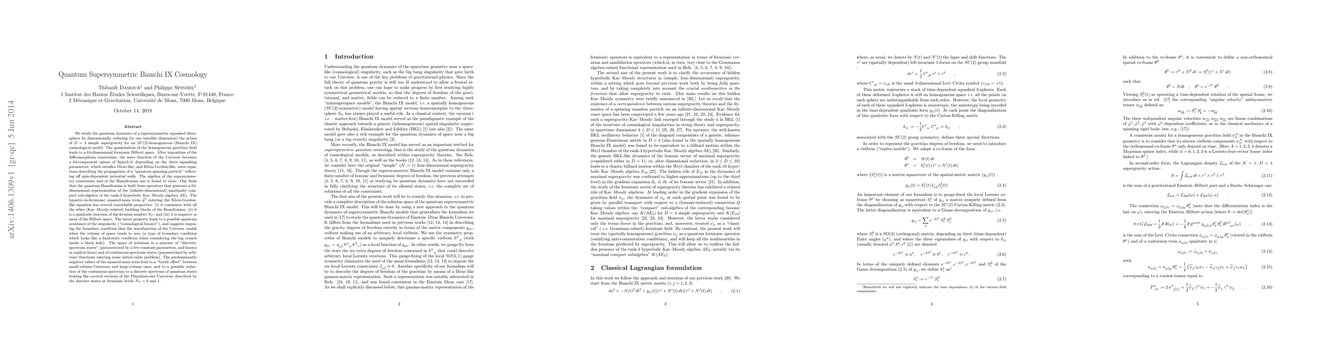 We study the quantum dynamics of a supersymmetric squashed three-sphere by dimensionally reducing to one timelike dimension the action of D=4 simple supergravity for a Bianchi IX cosmological model. After imposition of the diffeomorphism constraints, the wave function of the Universe becomes a spinor of Spin(8,4) depending on the three squashing parameters, which satisfies Dirac, and Klein-Gordon-like, wave equations describing the propagation of a quantum spinning particle reflecting off spin-dependent potential walls. The algebra of the susy constraints and of the Hamiltonian one is found to close. One finds that the quantum Hamiltonian is built from operators that generate a 64-dimensional representation of the maximally compact sub-algebra of the rank-3 hyperbolic Kac-Moody algebra AE3. The (quartic-in-fermions) squared-mass term entering the Klein-Gordon-like equation has several remarkable properties: 1)it commutes with all the other (Kac-Moody-related) building blocks of the Hamiltonian; 2)it is a quadratic function of the fermion number NF; 3)it is negative in most of the Hilbert space. The latter property leads to a possible quantum avoidance of the singularity ("cosmological bounce"), and suggests imposing the boundary condition that the wavefunction of the Universe vanish when the volume of space tends to zero. The space of solutions is a mixture of "discrete-spectrum states" (explicitely given) and of continuous-spectrum states (parametrized by arbitrary functions entering some initial-value problem). The predominantly negative values of the squared-mass term lead to a "bottle effect" between small and large volume-Universes and to a possible reduction of the continuous spectrum to a discrete spectrum of quantum states looking like excited versions of the Planckian-size Universes described by the discrete states at fermionic levels NF=0 and 1.