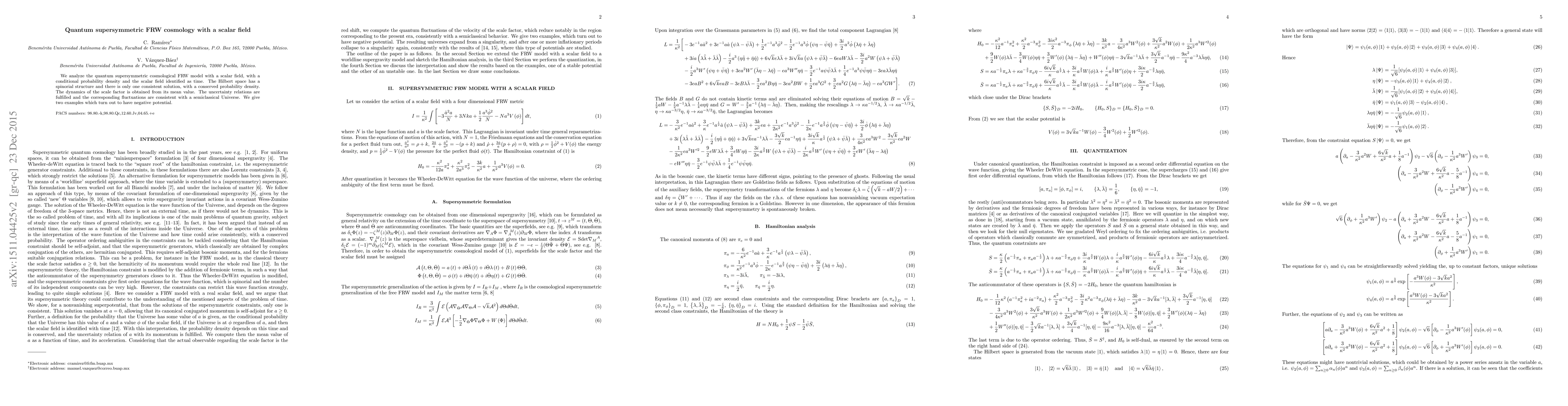 This paper investigates a quantum supersymmetric Friedmann-Robertson-Walker (FRW) cosmology model featuring a scalar field, revealing a unique solution with conserved probability density and consistent fluctuations aligning with a semiclassical Universe. The study also provides examples with negative potential.