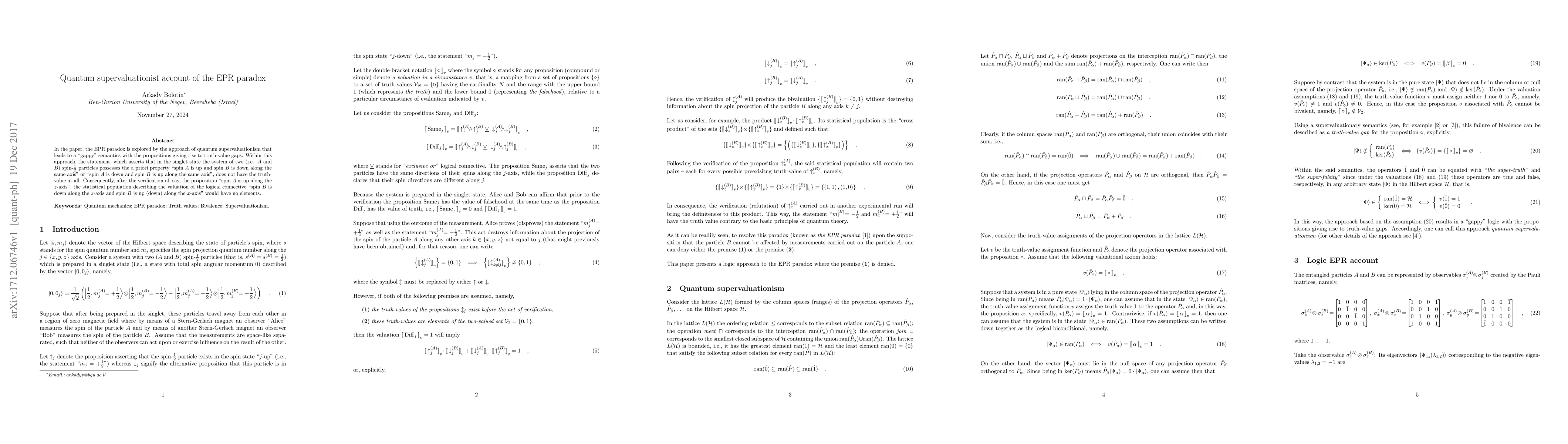 In the paper, the EPR paradox is explored by the approach of quantum supervaluationism that leads to a "gappy" semantics with the propositions giving rise to truth-value gaps. Within this approach, the statement, which asserts that in the singlet state the system of two (i.e., A and B) spin-1/2 particles possesses the a priori property "spin A is up and spin B is down along the same axis" or "spin A is down and spin B is up along the same axis", does not have the truth-value at all. Consequently, after the verification of, say, the proposition "spin A is up along the z-axis", the statistical population describing the valuation of the logical connective "spin B is down along the z-axis and spin B is up (down) along the x-axis" would have no elements.