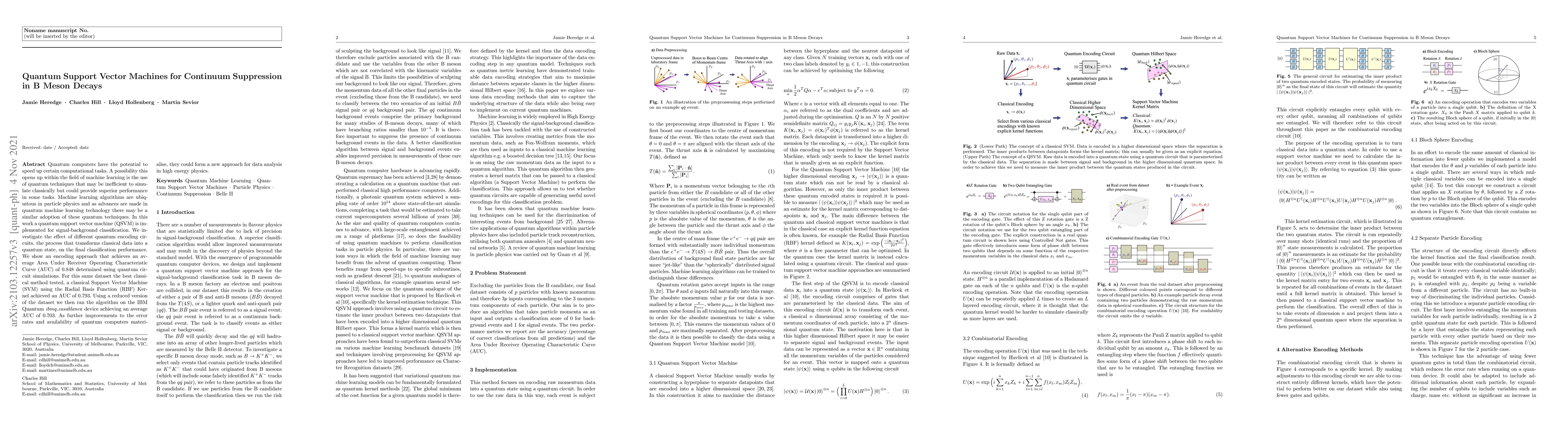 Researchers developed a quantum support vector machine for signal-background classification in particle physics, achieving an average AUC of 0.848 compared to 0.793 using classical methods on a simulated dataset.