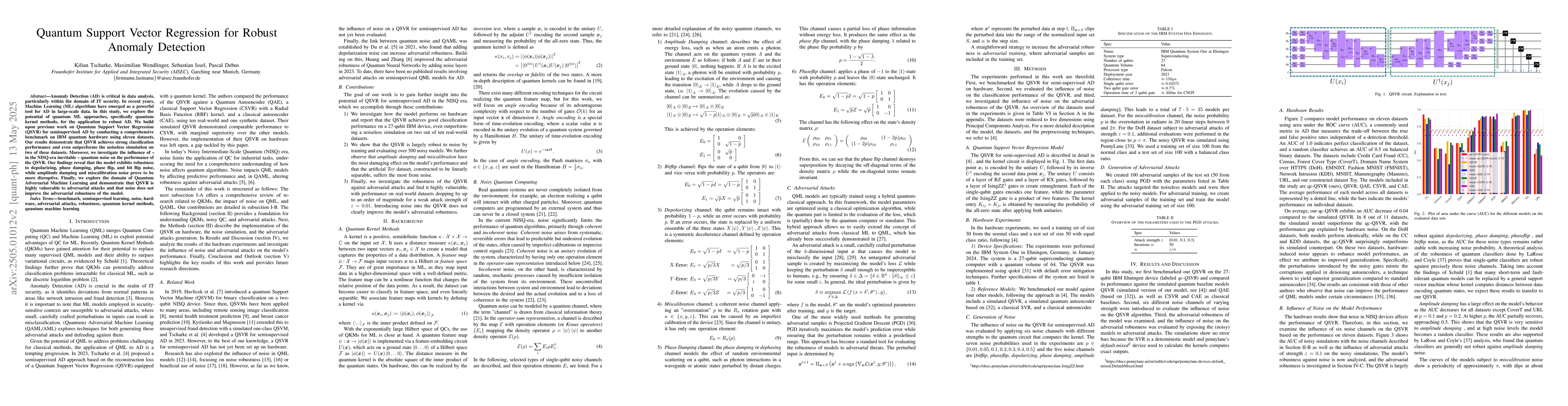 This paper investigates Quantum Support Vector Regression (QSVR) for robust anomaly detection, demonstrating its performance on IBM quantum hardware. The results show QSVR's effectiveness and robustness against various quantum noise types, though it remains vulnerable to adversarial attacks.