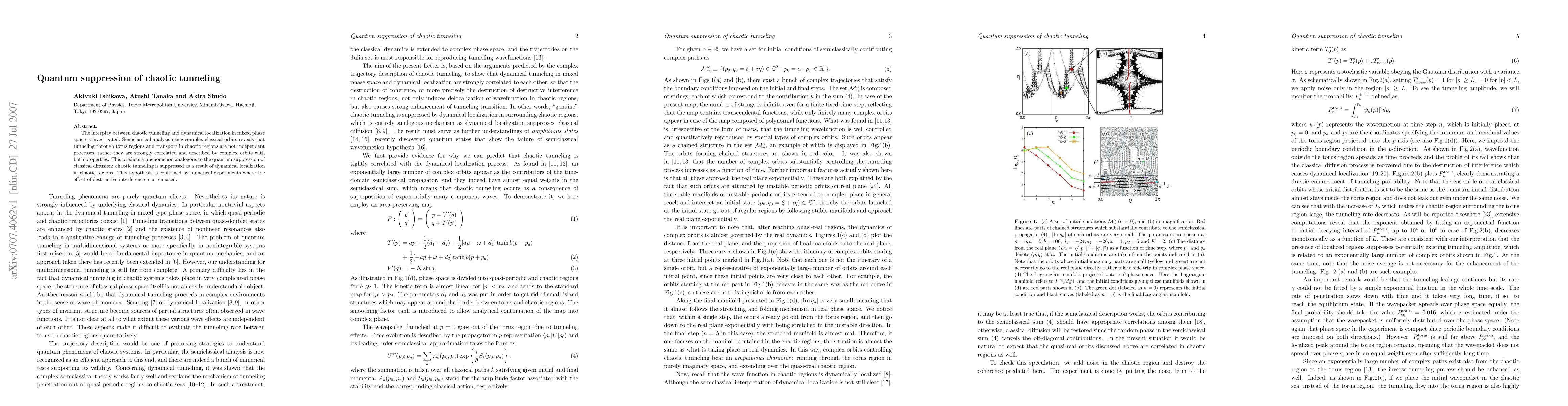 The study investigates the relationship between chaotic tunneling and dynamical localization, showing that these processes are interconnected via complex classical orbits. Numerical experiments confirm the quantum suppression of chaotic tunneling due to dynamical localization, revealing destructive interference attenuation.