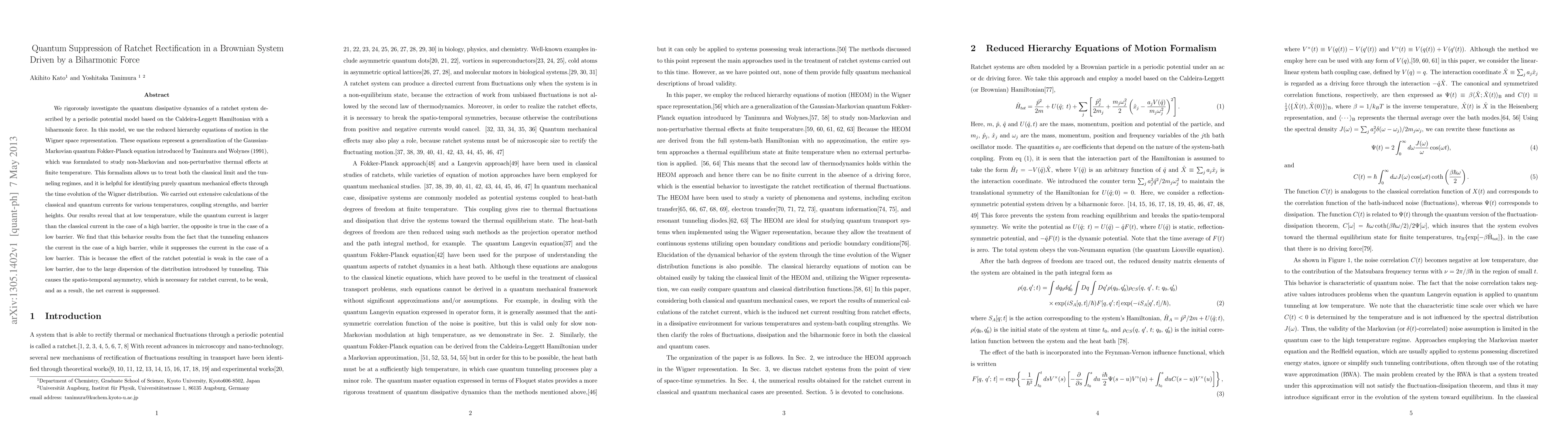 We rigorously investigate the quantum dissipative dynamics of a ratchet system described by a periodic potential model based on the Caldeira-Leggett Hamiltonian with a biharmonic force. In this model, we use the reduced hierarchy equations of motion in the Wigner space representation. These equations represent a generalization of the Gaussian-Markovian quantum Fokker-Planck equation introduced by Tanimura and Wolynes (1991), which was formulated to study non-Markovian and non-perturbative thermal effects at finite temperature. This formalism allows us to treat both the classical limit and the tunneling regimes, and it is helpful for identifying purely quantum mechanical effects through the time evolution of the Wigner distribution. We carried out extensive calculations of the classical and quantum currents for various temperatures, coupling strengths, and barrier heights. Our results reveal that at low temperature, while the quantum current is larger than the classical current in the case of a high barrier, the opposite is true in the case of a low barrier. We find that this behavior results from the fact that the tunneling enhances the current in the case of a high barrier, while it suppresses the current in the case of a low barrier. This is because the effect of the ratchet potential is weak in the case of a low barrier, due to the large dispersion of the distribution introduced by tunneling. This causes the spatio-temporal asymmetry, which is necessary for ratchet current, to be weak, and as a result, the net current is suppressed.