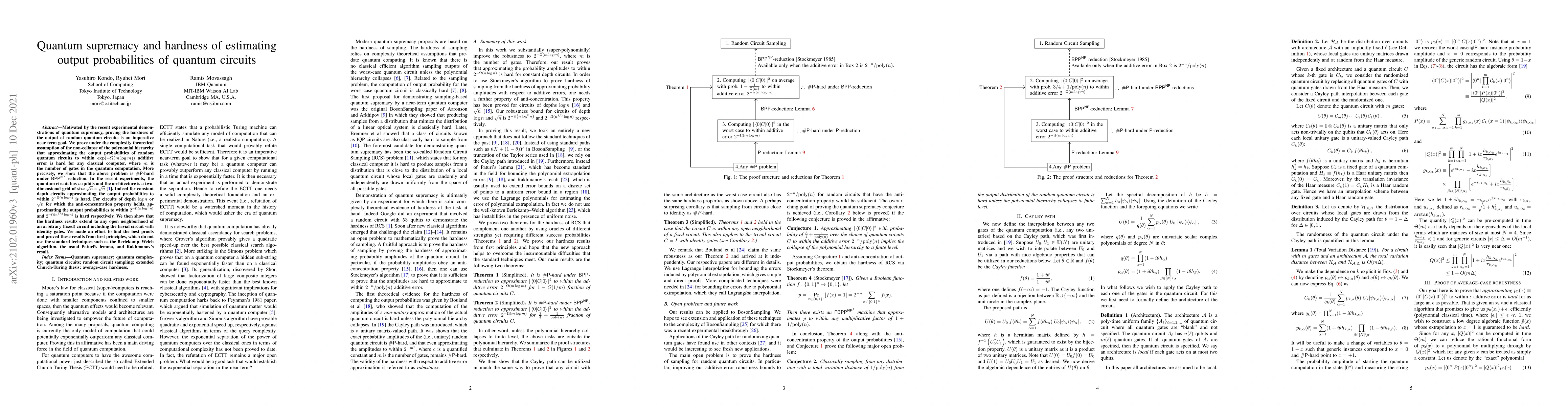This paper proves the computational hardness of estimating output probabilities of random quantum circuits under complexity theoretical assumptions, establishing that approximating these probabilities within certain error bounds is hard for classical computers. The results extend to various circuit depths and show that even small perturbations of fixed circuits retain this hardness.