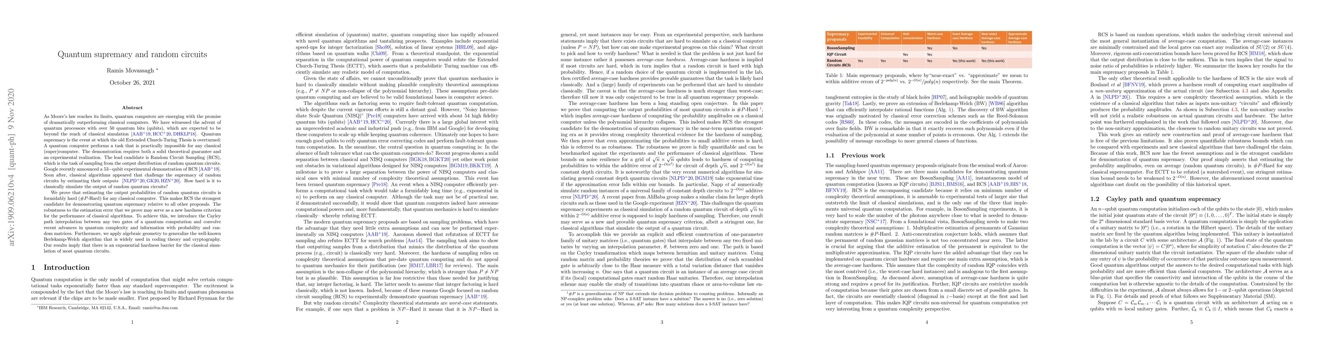 As Moore's law reaches its limits, quantum computers are emerging with the promise of dramatically outperforming classical computers. We have witnessed the advent of quantum processors with over $50$ quantum bits (qubits), which are expected to be beyond the reach of classical simulation. Quantum supremacy is the event at which the old Extended Church-Turing Thesis is overturned: A quantum computer performs a task that is practically impossible for any classical (super)computer. The demonstration requires both a solid theoretical guarantee and an experimental realization. The lead candidate is Random Circuit Sampling (RCS), which is the task of sampling from the output distribution of random quantum circuits. Google recently announced a $53-$qubit experimental demonstration of RCS. Soon after, classical algorithms appeared that challenge the supremacy of random circuits by estimating their outputs. How hard is it to classically simulate the output of random quantum circuits? We prove that estimating the output probabilities of random quantum circuits is formidably hard ($\#P$-Hard) for any classical computer. This makes RCS the strongest candidate for demonstrating quantum supremacy relative to all other proposals. The robustness to the estimation error that we prove may serve as a new hardness criterion for the performance of classical algorithms. To achieve this, we introduce the Cayley path interpolation between any two gates of a quantum computation and convolve recent advances in quantum complexity and information with probability and random matrices. Furthermore, we apply algebraic geometry to generalize the well-known Berlekamp-Welch algorithm that is widely used in coding theory and cryptography. Our results imply that there is an exponential hardness barrier for the classical simulation of most quantum circuits.