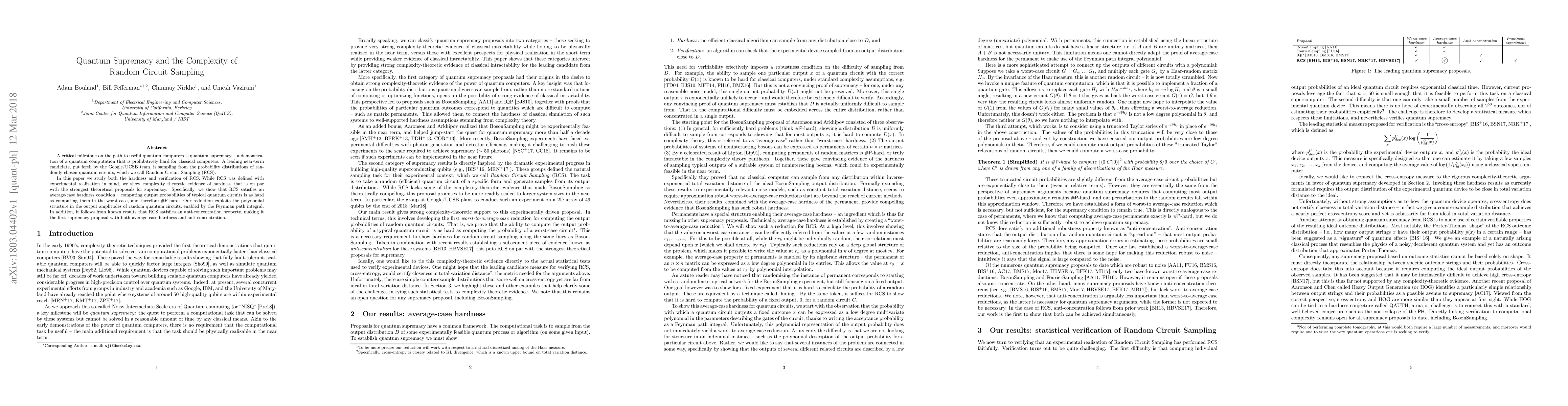 This paper demonstrates that Random Circuit Sampling (RCS) is a strong candidate for quantum supremacy, showing both its complexity-theoretic hardness and its verifiability. RCS is proven to be #P-hard and possesses an anti-concentration property, making it a compelling approach for demonstrating a quantum computer's superiority over classical counterparts.