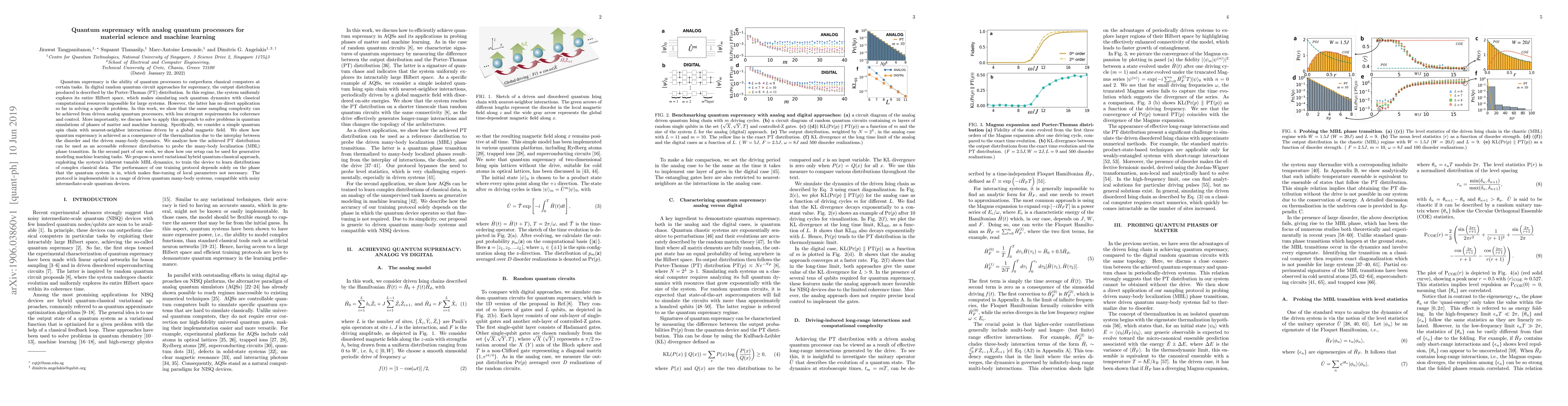 This paper demonstrates quantum supremacy using driven analog quantum processors, showing that these systems can achieve the same sampling complexity as digital quantum circuits but with less stringent coherence requirements. The authors apply this approach to simulate phases of matter and machine learning, proposing a novel variational hybrid quantum-classical method for generative modeling that leverages many-body localization dynamics.