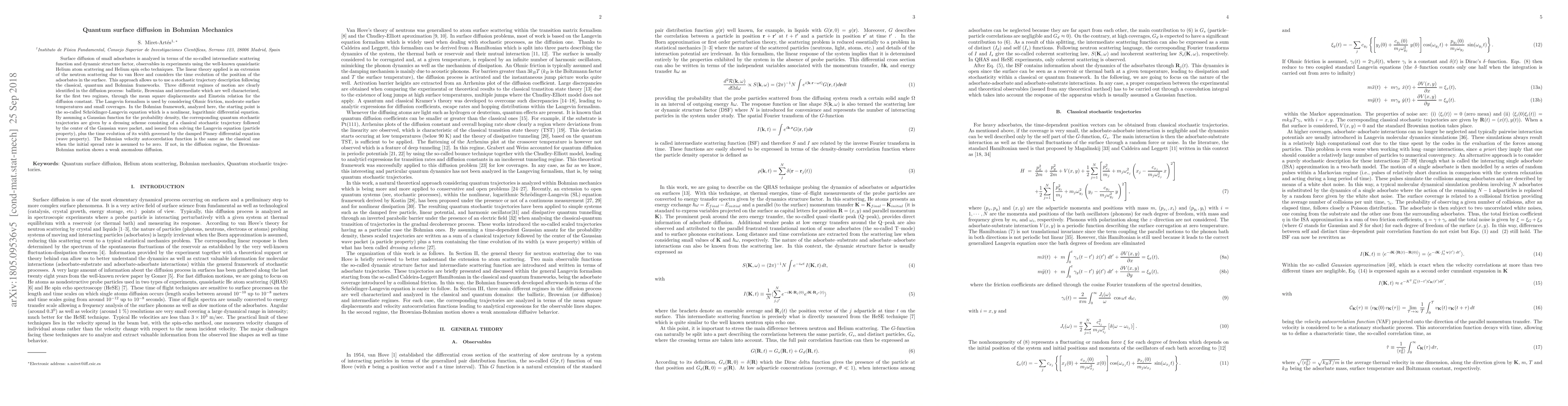Surface diffusion of small adsorbates is analyzed in terms of the so-called intermediate scattering function and dynamic structure factor, observables in experiments using the well-known quasielastic Helium atom scattering and Helium spin echo techniques. The linear theory used is an extension of the neutron scattering due to van Hove and considers the time evolution of the position of the adsorbates in the surface. This approach allows us to use a stochastic trajectory description following the classical, quantum and Bohmian frameworks. Three regimes of motion are clearly identified in the diffusion process: ballistic, Brownian and intermediate which are well characterized, for the first two regimes, through the mean square displacements and Einstein relation for the diffusion constant. The Langevin formalism is used by considering Ohmic friction, moderate surface temperatures and small coverages. In the Bohmian framework, the starting point is the so-called Schr\"odinger-Langevin equation which is a nonlinear, logarithmic differential equation. By assuming a Gaussian function for the probability density, the corresponding quantum stochastic trajectories are given by a dressing scheme consisting of a classical stochastic trajectory of the center of the Gaussian wave packet, issued from solving the Langevin equation (particle property), plus the time evolution of its width governed by the damped Pinney differential equation (wave property). The velocity autocorrelation function is the same as the classical one when the initial spread rate is assumed to be zero. If not, in the diffusion regime, the Brownian-Bohmian motion shows a weak anomalous diffusion.