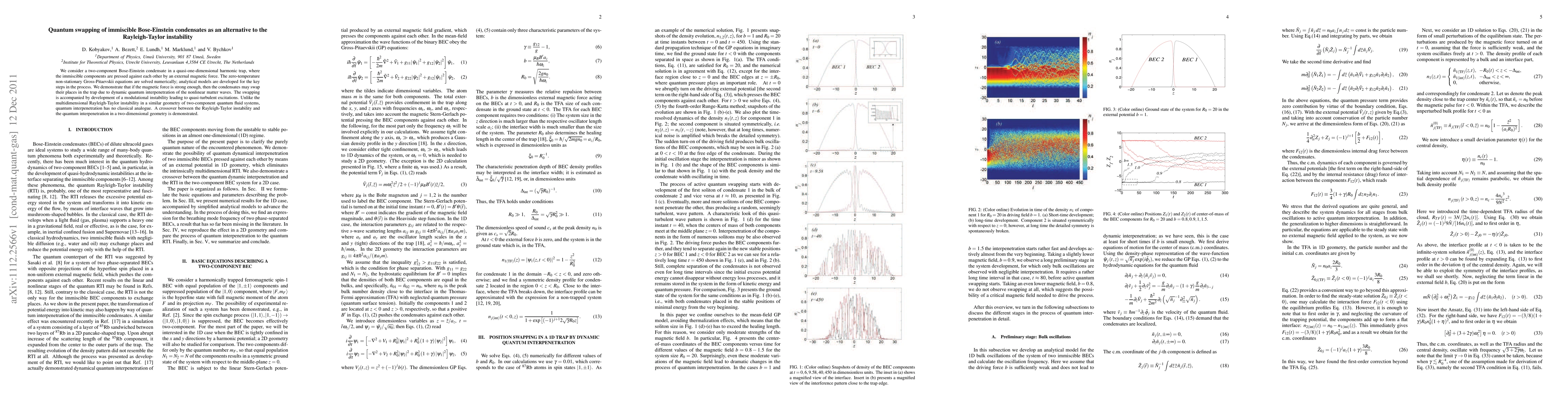 This paper investigates quantum swapping of immiscible Bose-Einstein condensates in a quasi-one-dimensional trap, showing that strong magnetic forces can induce dynamic quantum interpenetration, leading to modulational instability and quasi-turbulent excitations. Unlike the classical Rayleigh-Taylor instability, this quantum process lacks a classical analogue.
