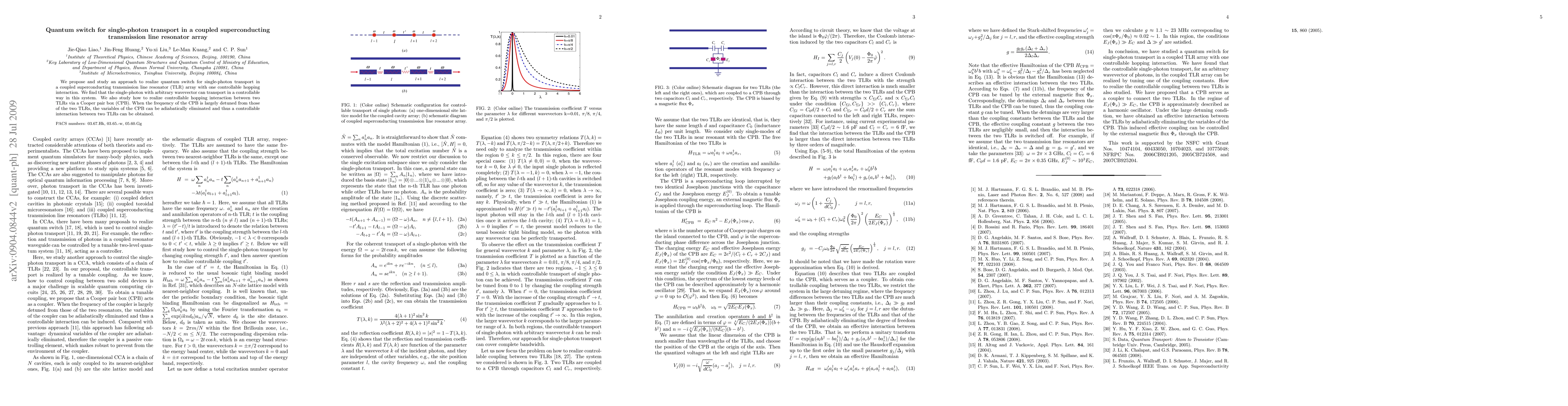 This paper proposes a quantum switch for single-photon transport using a coupled superconducting transmission line resonator array with a controllable hopping interaction. The study demonstrates that single-photons can be transported in a controllable manner, and achieves this interaction via a superconducting quantum interference device (SQUID).