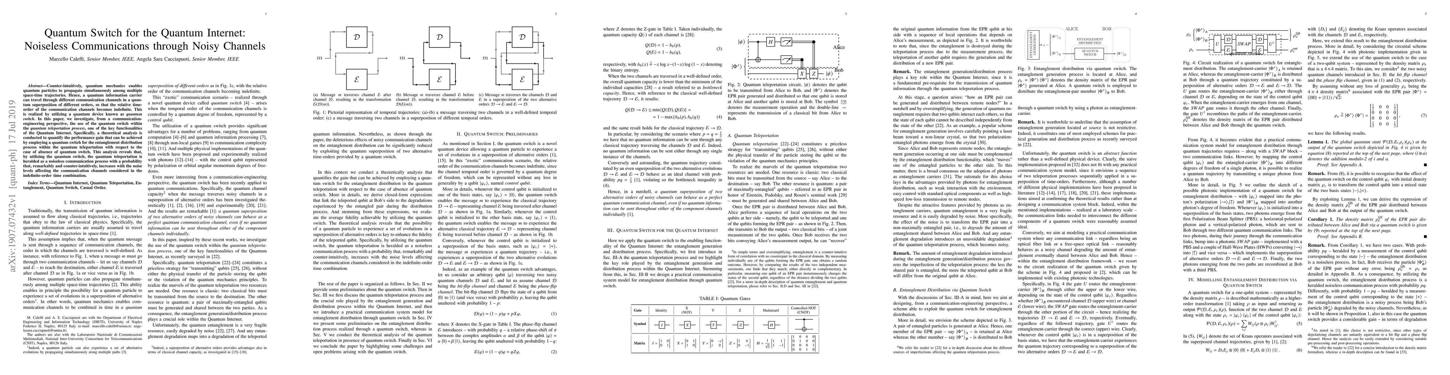 Counter-intuitively, quantum mechanics enables quantum particles to propagate simultaneously among multiple space-time trajectories. Hence, a quantum information carrier can travel through different communication channels in a quantum superposition of different orders, so that the relative time-order of the communication channels becomes indefinite. This is realized by utilizing a quantum device known as quantum switch. In this paper, we investigate, from a communication-engineering perspective, the use of the quantum switch within the quantum teleportation process, one of the key functionalities of the Quantum Internet. Specifically, a theoretical analysis is conducted to quantify the performance gain that can be achieved by employing a quantum switch for the entanglement distribution process within the quantum teleportation with respect to the case of absence of quantum switch. This analysis reveals that, by utilizing the quantum switch, the quantum teleportation is heralded as a noiseless communication process with a probability that, remarkably and counter-intuitively, increases with the noise levels affecting the communication channels considered in the indefinite-order time combination.