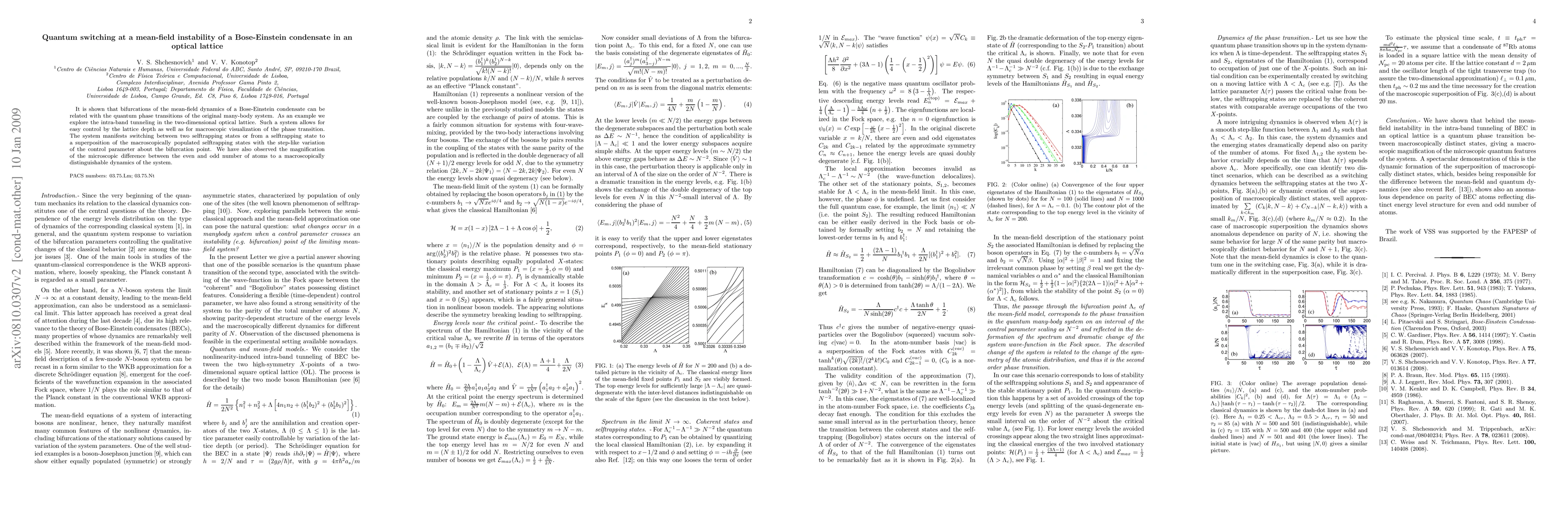 This paper demonstrates quantum switching in a Bose-Einstein condensate within an optical lattice, linking mean-field bifurcations to quantum phase transitions. The study highlights intra-band tunneling in two-dimensional lattices, showcasing macroscopic visualization of phase transitions and switching between self-trapping states.