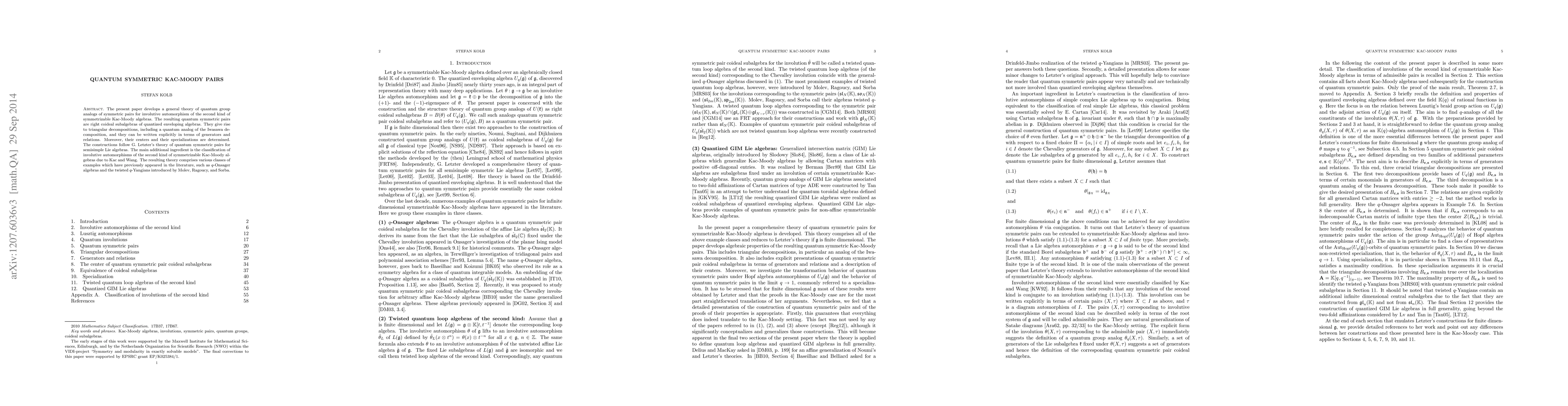 This paper develops a theory for quantum group analogs of symmetric pairs in symmetrizable Kac-Moody algebras, constructing explicit triangular decompositions and determining their centers and specializations, following G. Letzter's approach and incorporating Kac and Wang's classification of relevant automorphisms.