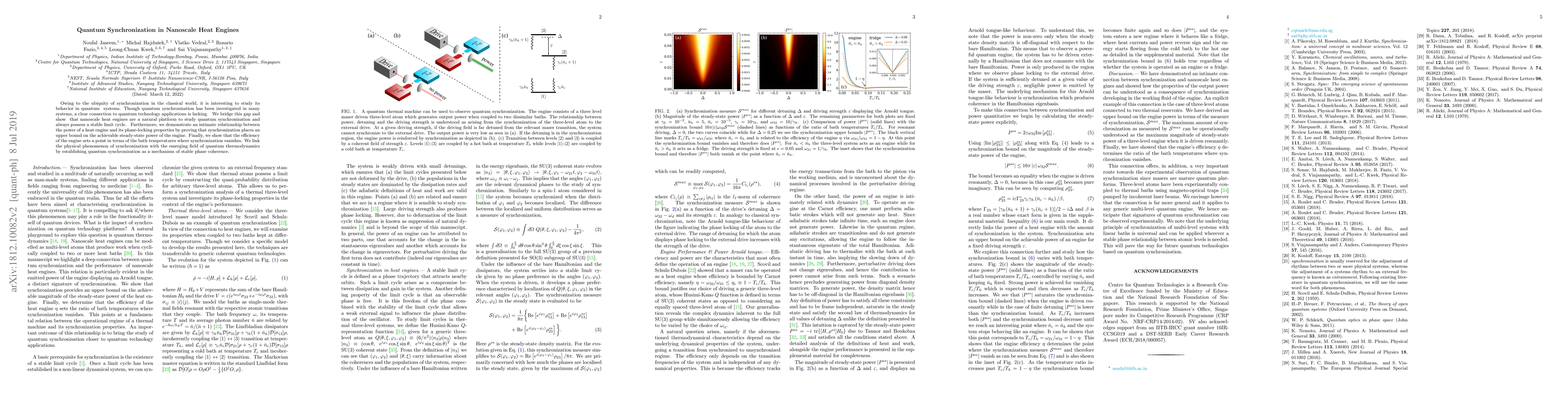 This paper explores quantum synchronization in nanoscale heat engines, demonstrating that they exhibit stable limit cycles. It reveals a connection between the engine's power and its synchronization properties, establishing synchronization as a limit to the achievable steady-state power and showing that synchronization vanishes at a specific efficiency-dependent temperature.